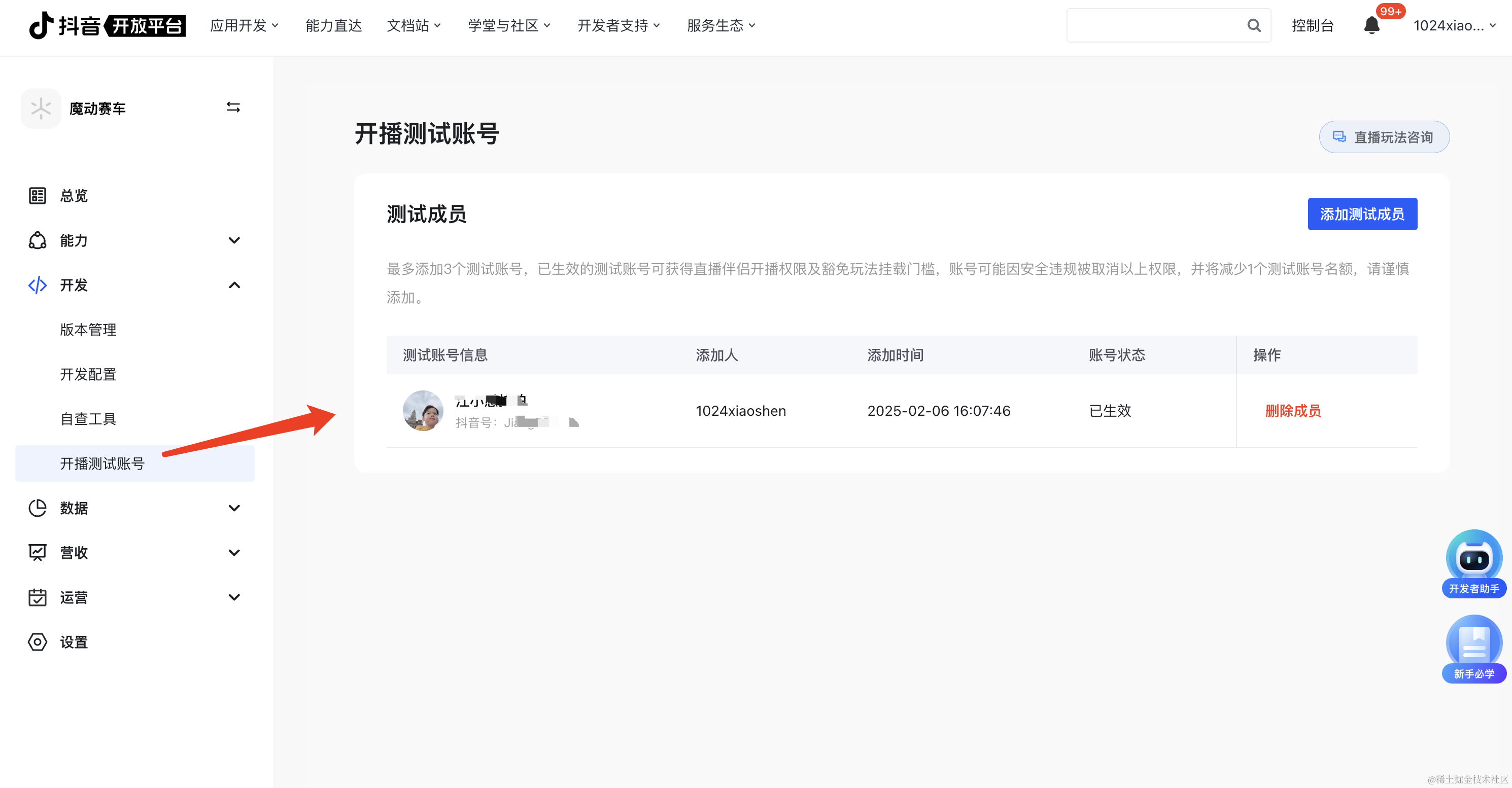 在小玩法后台开通测试账号,这个账号也是你的抖音账号,然后登录直播伴侣的时候,也要用这个账号。