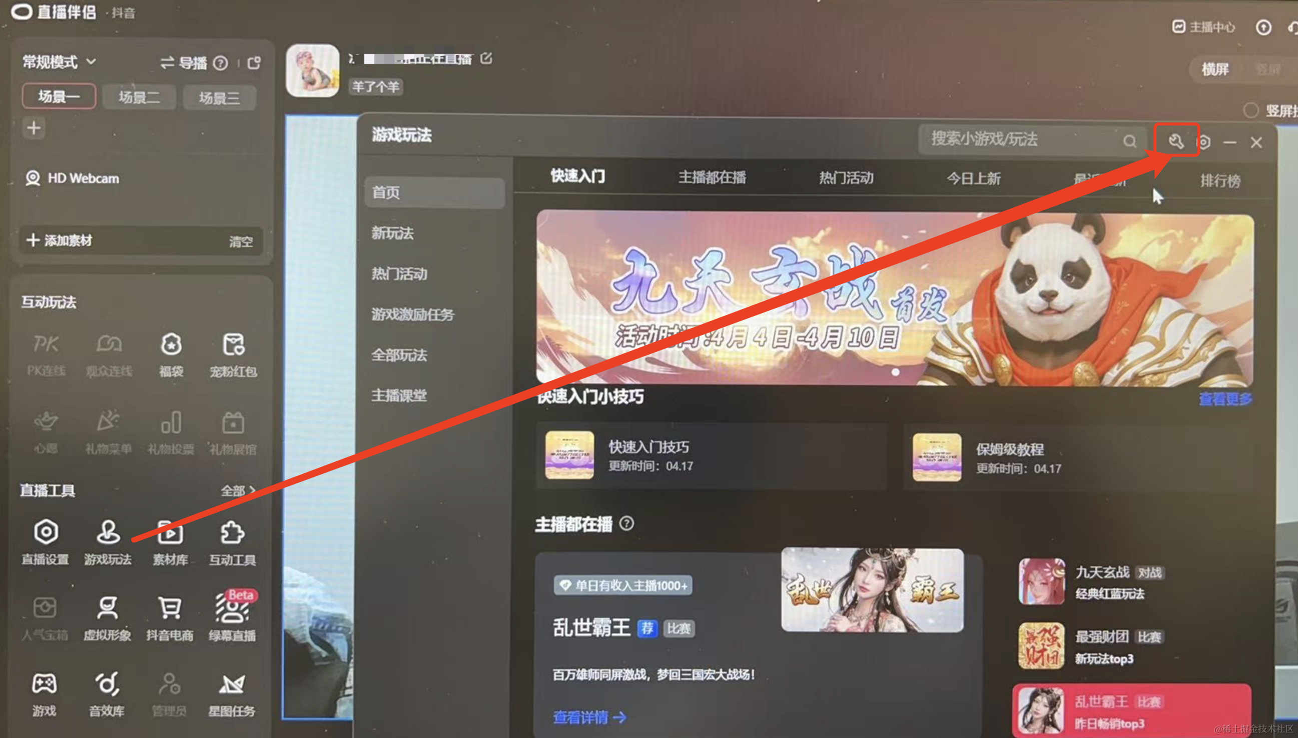 2.pc直播伴侣端,登录有测试权限的账号后,先开启直播,进入直播伴侣-直播工具-游戏玩法,右上角可见小扳手入口。