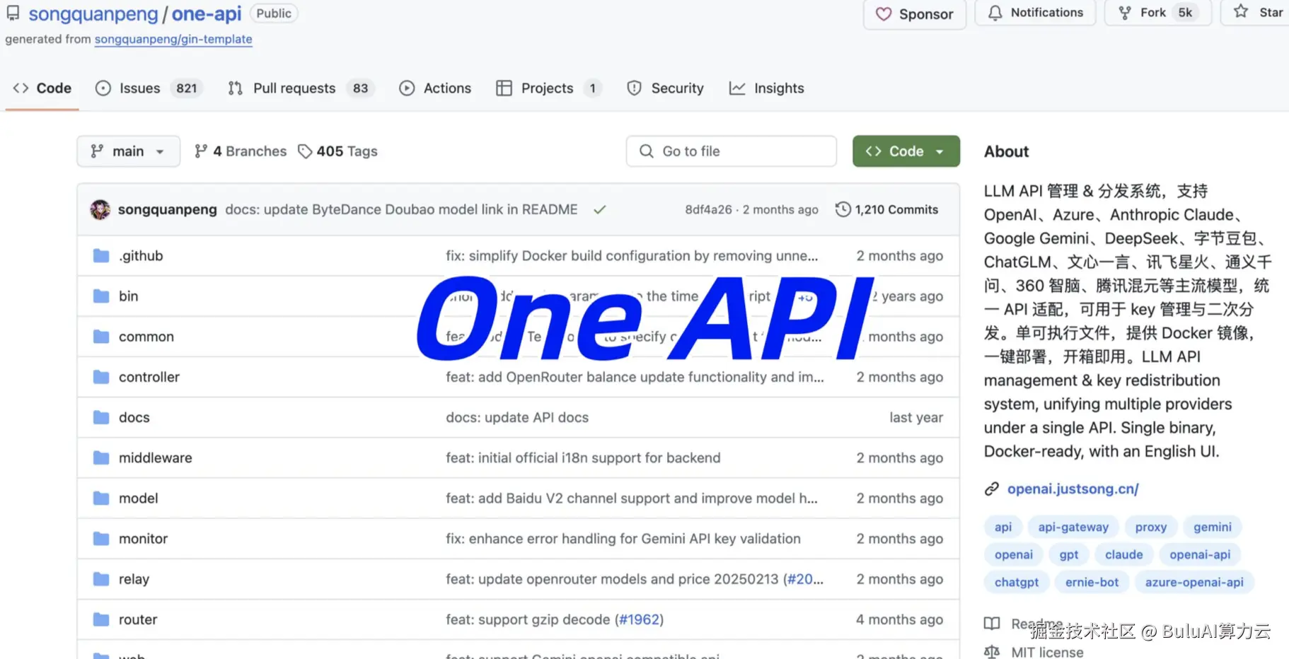One-API 是一个开源的 AI 大模型 API 管理与分发系统,旨在通过标准化接口(基于 OpenAI 格式)实现对多种主流大模型的统一访问。它支持包括 OpenAI ChatGPT、Anthropic Claude、Google Gemini、百度文心一言、阿里通义千问等在内的 20+ 主流大模型。