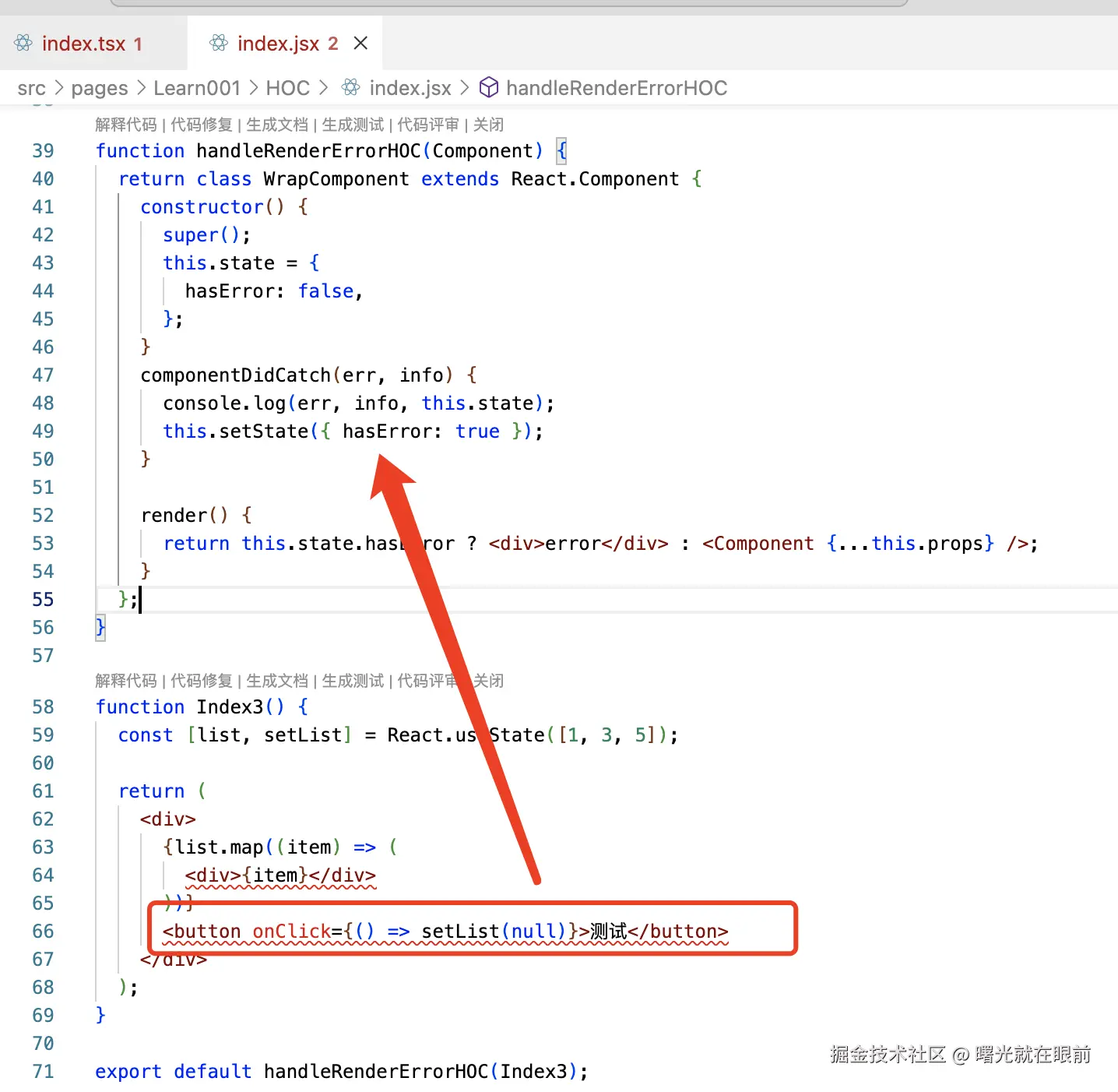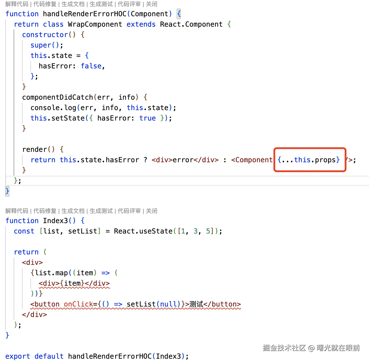 比如我们使用变量 list 存储一个数组,使用数组的 map 方法来渲染列表,但假如这个list 被置为 null(比如可能从接口中拿到一个 null 并且没有处理这个数据),那么 map 方法就会报错,我们可以用一个 HOC 来处理渲染错误,如果出现错误,就展示 Error