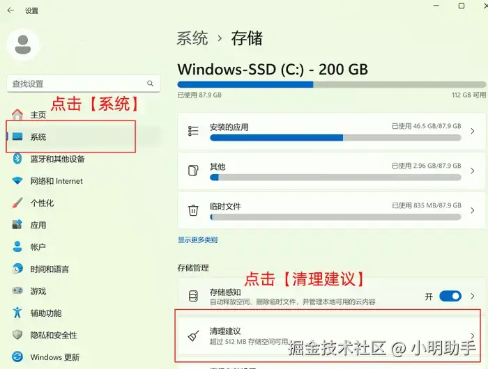 如果我们担心自己去手动删除硬盘里面的文件会误删重要的系统数据,我们该怎么清理电脑?我们可以选择在电脑设置中找到【清理建议】功能,让电脑系统扫描出无用文件,我们再进行删除,这是一个较为保险的电脑垃圾清理窍门。具体做法如下: