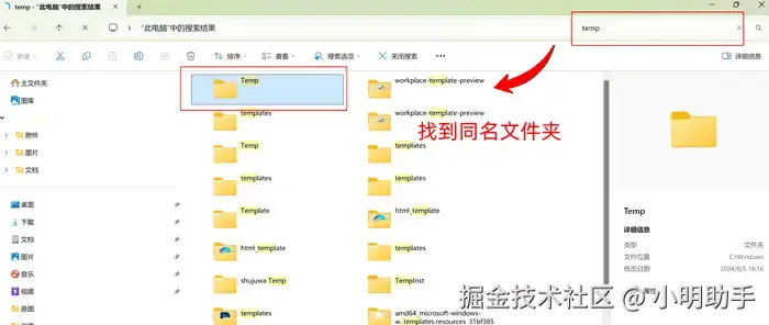 如果想要更为彻底地进行电脑垃圾清理,硬盘里面的临时文件夹也是不错的对象。怎么给电脑全面彻底的清理垃圾?在【此电脑】中的搜索框上输入【temp】,等待搜索完成后,找到同名文件夹后点击进入,如果认真查看后发现都是无用或过期文件,可以选择全部清理掉。