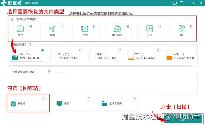 步骤1:打开软件后,在简洁的主页面上方勾选出目标文件的类型,然后在左下方勾选【回收站】,点击【扫描】,让软件先进的扫描技术直接扫描该存储媒介,将可恢复文件扫描出来。