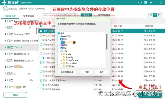 步骤2:在扫描出来的文件中寻找需要恢复的目标文件,选中后点击【导出】。最后在【浏览文件夹】的弹窗中选择恢复文件的存放位置。