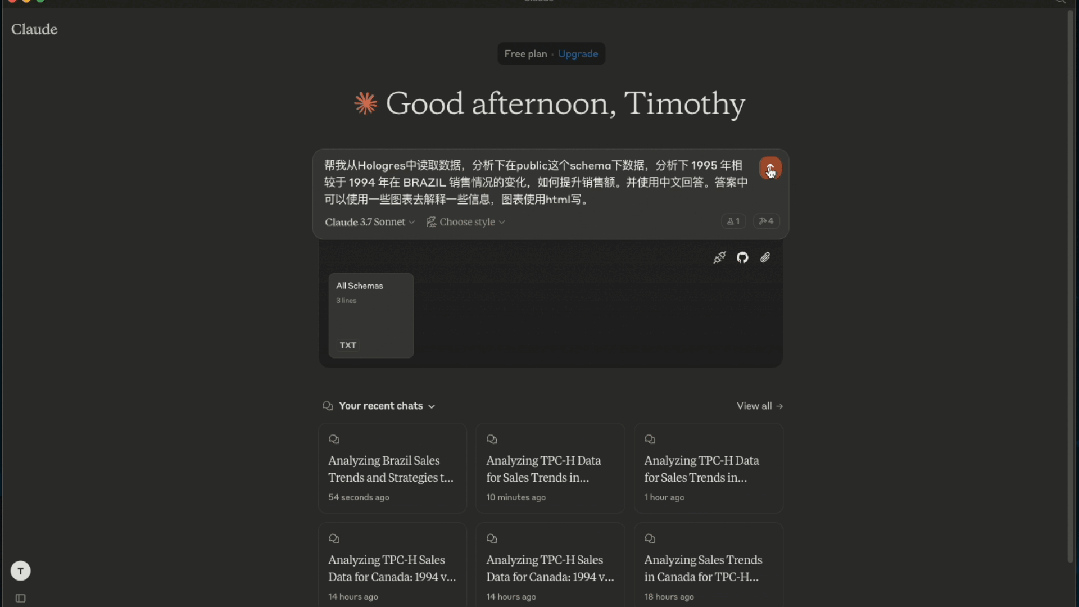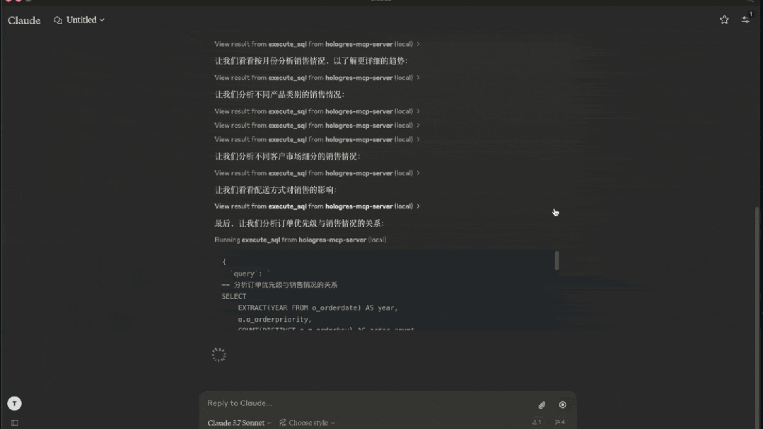 当我们查询相关内容的时候,Claude Desktop 就能自动使用 MCP 对接 Hologres 实例。