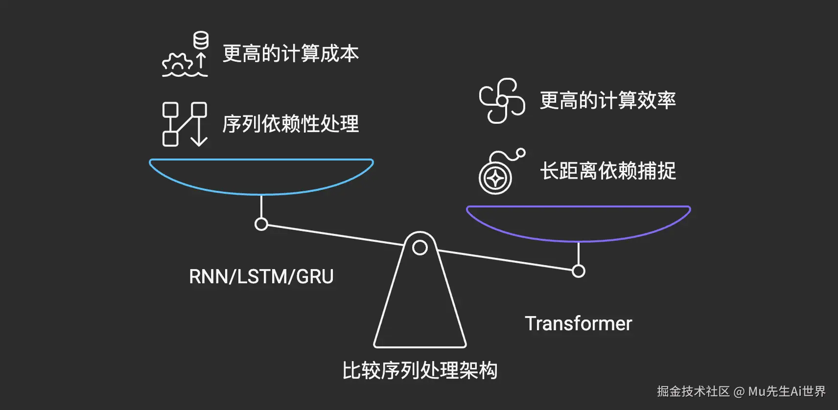▶ 长距离依赖: 对于需要捕捉较长距离依赖关系的任务(如理解一个长段落、记住很久以前的对话),LSTM或GRU通常比简单RNN更有效。