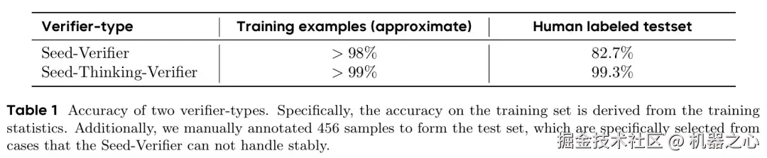表 1 展示了上述两种验证器的性能。结果表明,Seed-Verifier 在处理某些特殊情况时效果欠佳,而 Seed-Thinking-Verifier 展现出提供准确判断的卓越能力。尽管后者的思维过程消耗了大量 GPU 资源,但其产生的精确且稳健的奖励结果对于赋予策略强大的推理能力至关重要。