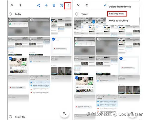 步骤 2 :在 Google 相册应用中,选择要传输到 PC 的照片,然后点击右上角的三点图标,点击立即备份。