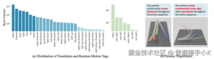 (a) 数据集统计和 (b) 多样的轨迹。a说明了 27 个平移运动(左)和 7 个旋转运动(右)的组成和分布,强调了 DataDoP 数据集中轨迹的复杂性和多样性. b基于相同的标题,我们的数据集包括仍然符合给定标题的不同轨迹。如图所示,轨迹在长度、方向和速度方面表现出变化,有效地展示了我们数据集中的多样