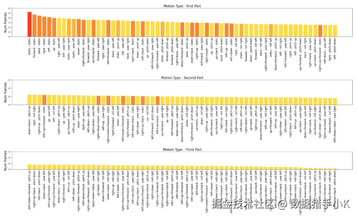 标签分布。Translation (平移) 和 Rotation (旋转) 组合的分布如图所示。不同的标记模式由黄色阴影表示,范围从深到浅:静态、仅平移、仅旋转以及平移和旋转。