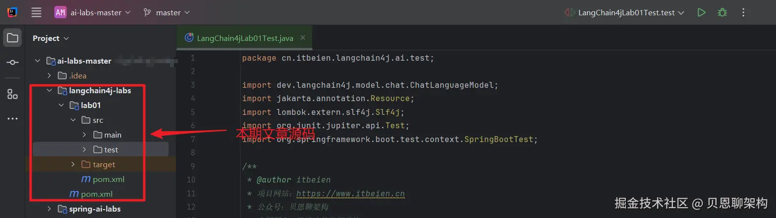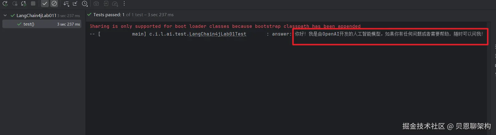 运行 cn.itbeien.langchain4j.ai.test.LangChain4jLab01Test进行单元测试