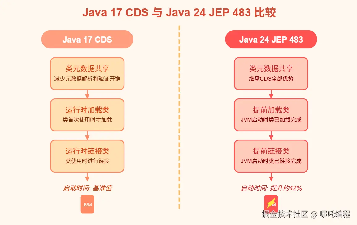 在 Java 17 中,类数据共享(CDS)功能通过共享类元数据来加速启动,但类加载和链接仍发生在运行时。JEP 483 在 Java 24 中进一步优化,不仅共享元数据,还提前加载和链接类,使启动时间比 Java 17 更短。