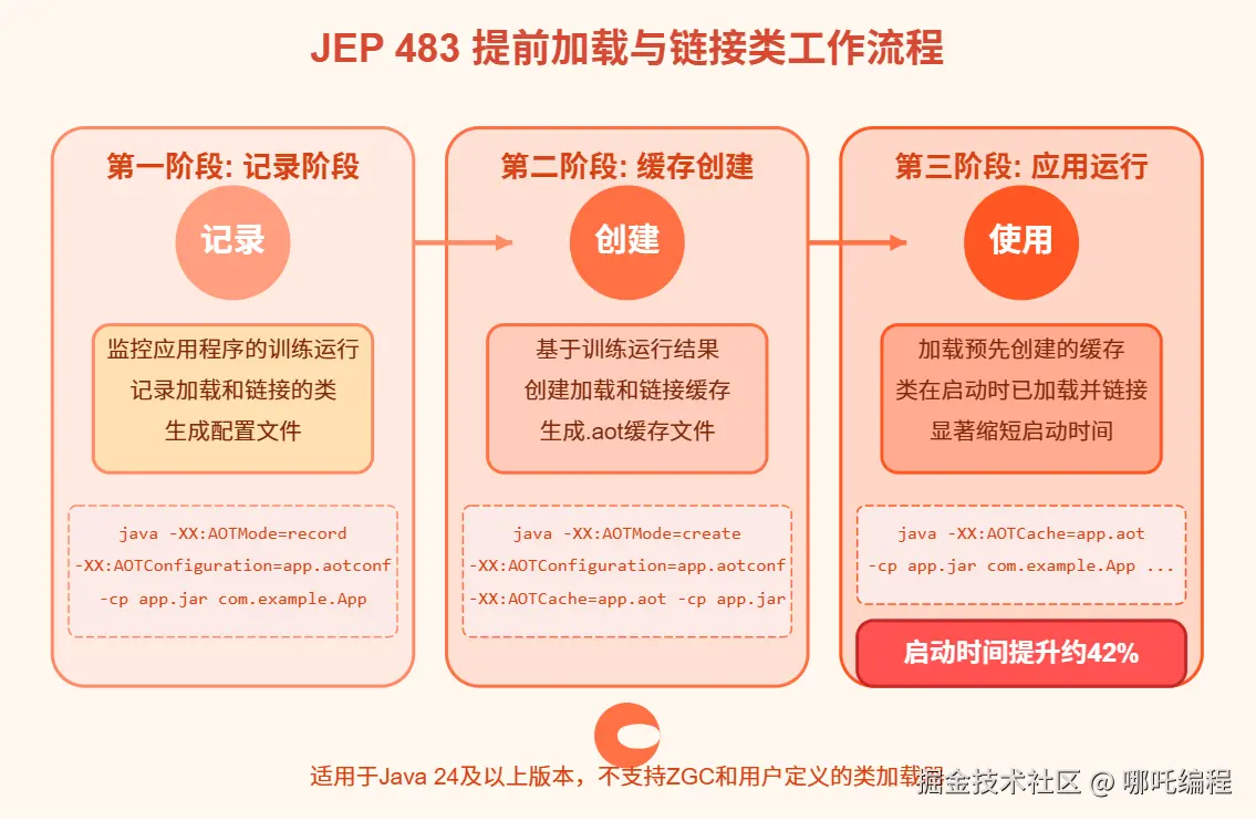 JEP 483,名为“提前加载与链接类”,是 Java 24 引入的一项功能,旨在通过在 HotSpot JVM 启动时让类的加载和链接状态立即可用来缩短启动时间。它通过监控应用程序的一次训练运行来记录使用的类,然后创建缓存供后续运行使用,从而实现这一目标。
