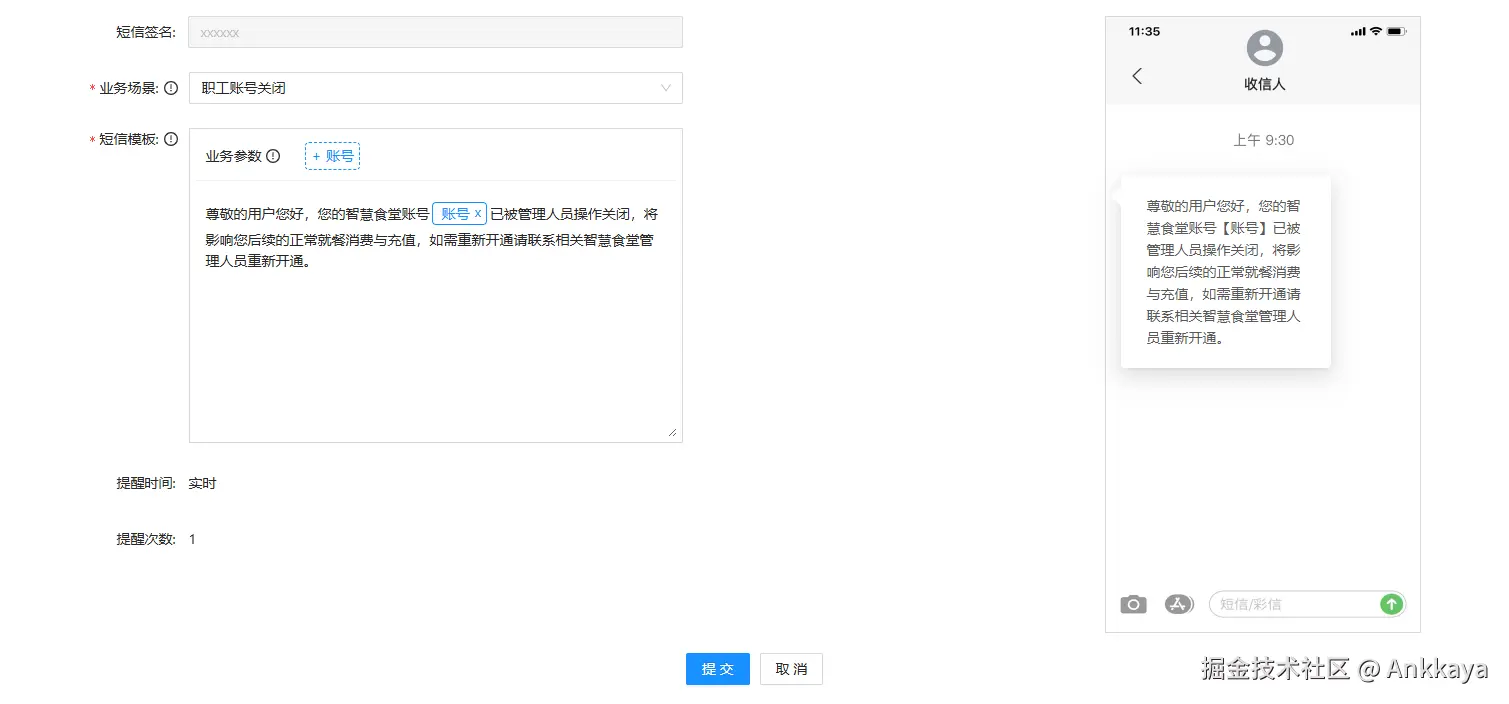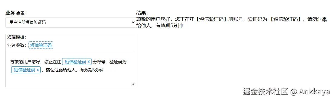 简易实现短信配置页面,下拉框选择业务场景,带出默认模板在下方显示,可以看到当前业务场景下的业务参数,右边显示最终结果