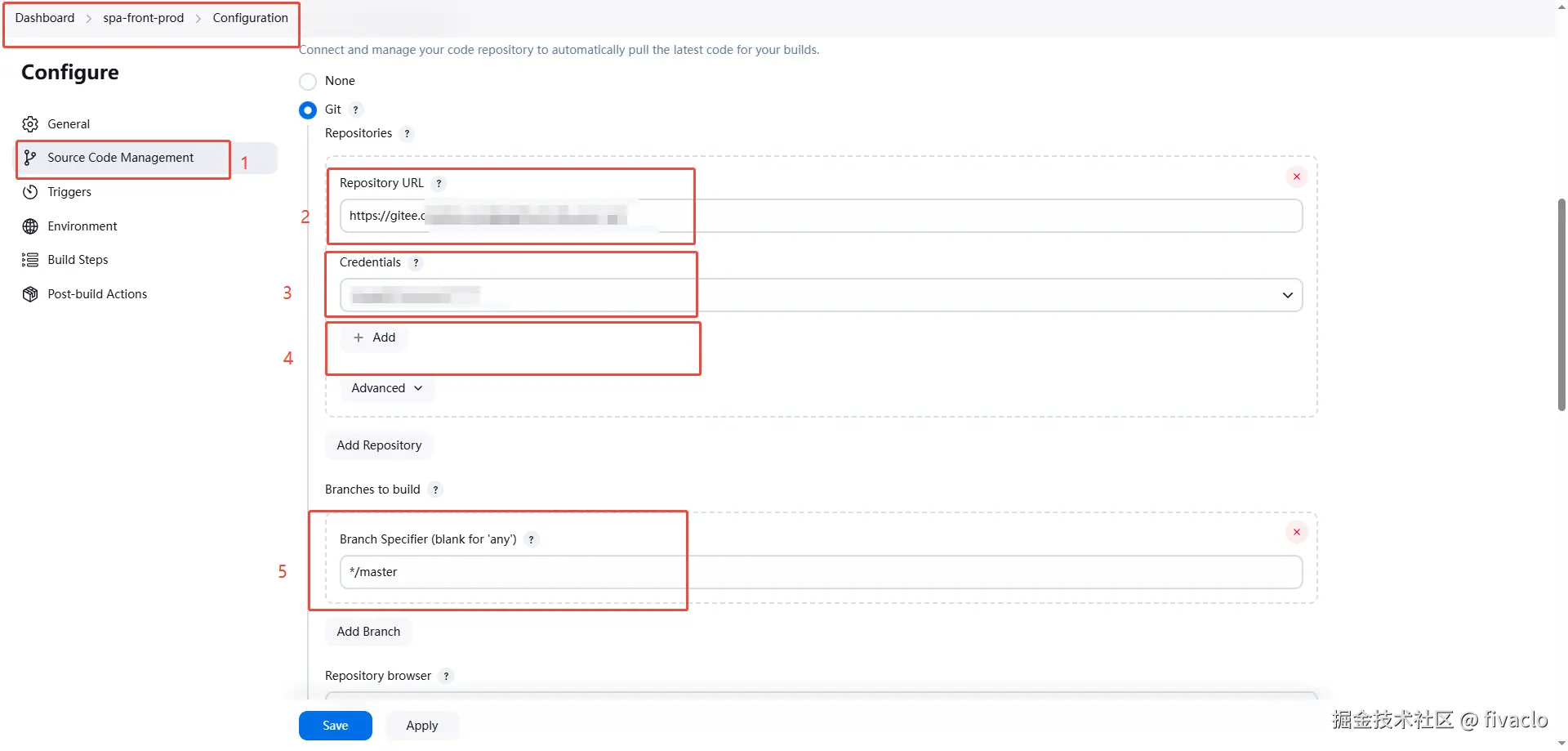填写代码仓库、凭证、构建代码分支。第一次应该没有凭证,点击4处的Add新建一个凭证,可以使用账号密码,也可以使用 token。