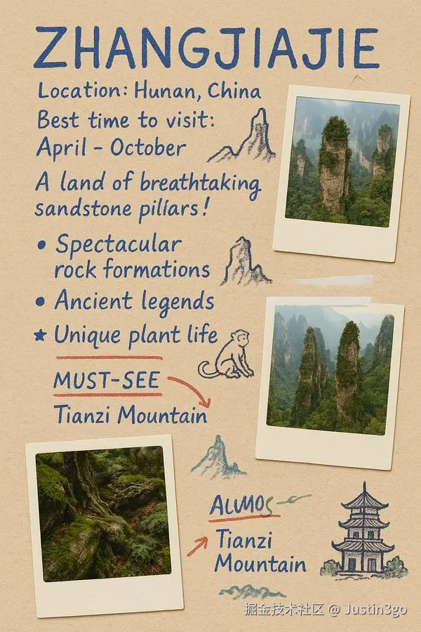点缀几张关于该景区的、看起来像是贴上去的小幅照片(可以是风景照、细节照,风格可以略显复古或像宝丽来照片)。 整体感觉要像一份由热情导游或资深游客精心制作的、生动有趣的个人导览手记。