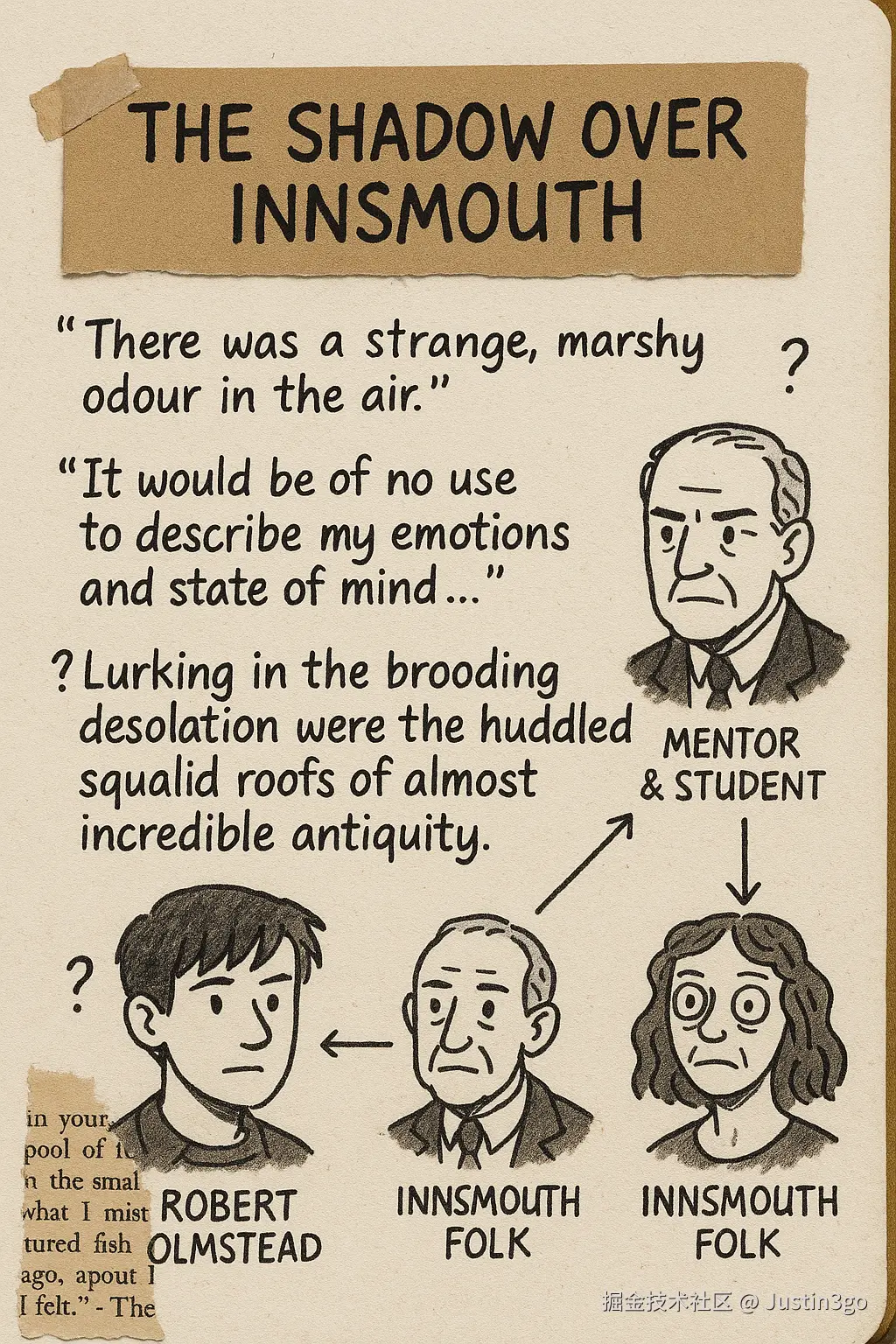 Generate an image with an aspect ratio of 2:3 and use English for the text within the image. This image is to simulate a personal notes page created by a reader for the novel The Shadow over Innsmouth. Style: Collage/scrapbook aesthetic, hand-drawn elements mixed with pasted items on a textured paper background (e.g. like a Moleskine notebook or vellum). Please include the following elements: HANDWRITTEN QUOTES: A few classic or impactful English sentences from a novel, written in a clear but handwritten font with a personal touch. CHARACTER DRAWINGS: Simple doodle-style headshots of 2-3 main characters, not necessarily very realistic, but more like quick impressionistic captures. CHARACTER RELATIONSHIPS DIAGRAM: Arrows drawn between the character doodles with short handwritten English text labels describing their relationships (e.g. "Siblings", "Lovers", "Mentor & Student", "Rivals"). PASTED CORNER OF PAGE: A small, realistic-looking piece that simulates a corner torn or cut from an actual novel page (on which some printed English text can be seen) that looks like it was taped or glued to the notes page. (Optional) Annotations: Possibly small handwritten notes or question marks next to quotes or characters. Layout: Elements should be arranged organically, perhaps overlapping slightly, to create the feel of a frequently used personal journal page. OVERALL FEEL: Thought provoking, analytical, personal, visually appealing.