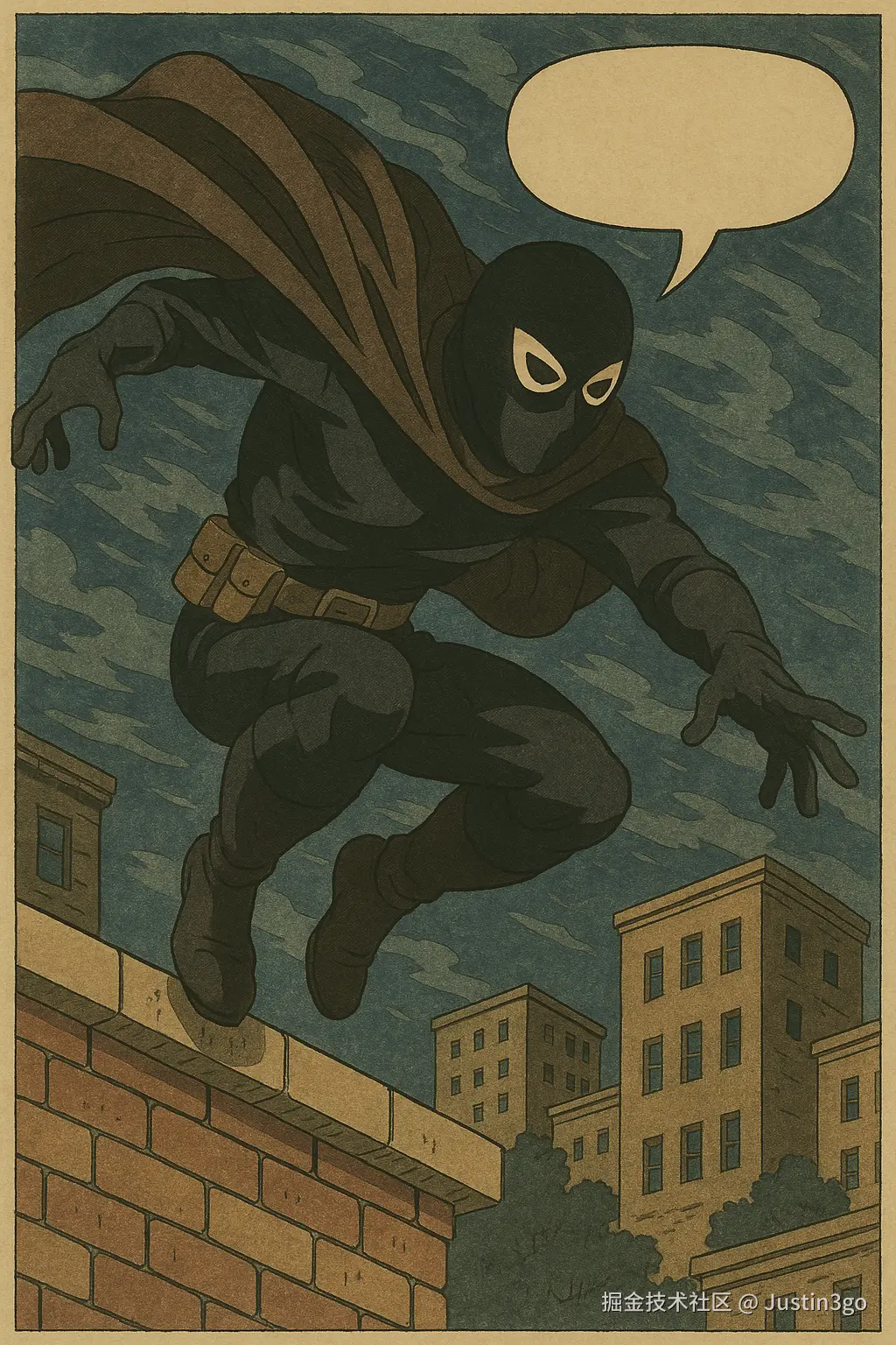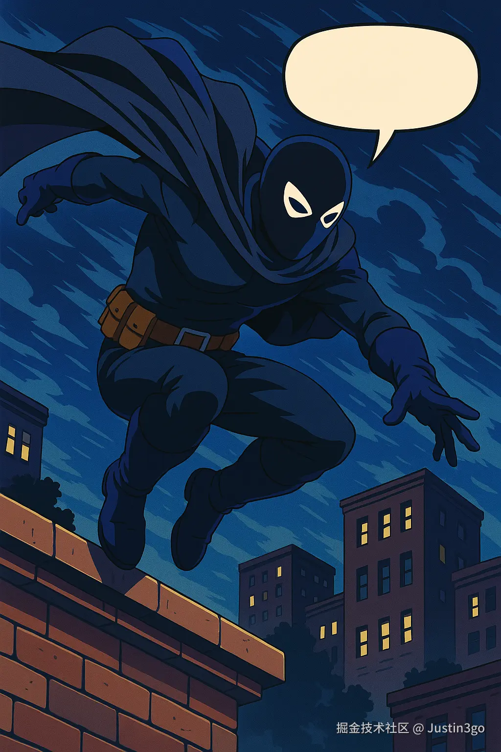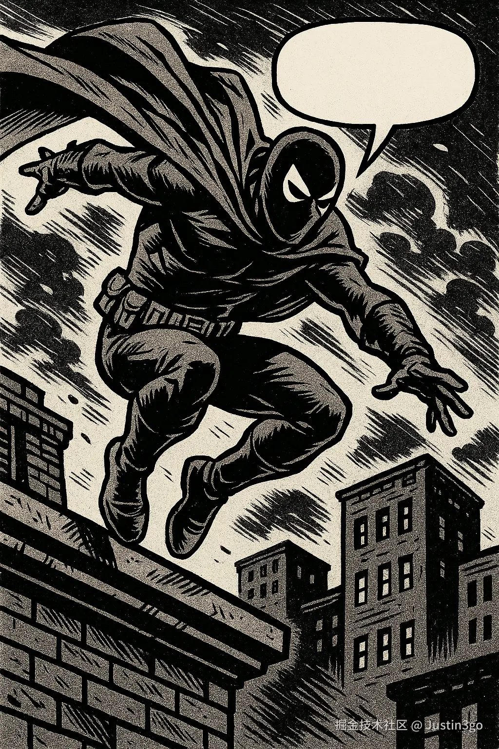 A masked hero jumping from a rooftop, comic book style with bold outlines and dialogue bubbles.(一位戴面具的英雄从屋顶跃下,漫画风格,粗线条描边并带对白气泡)