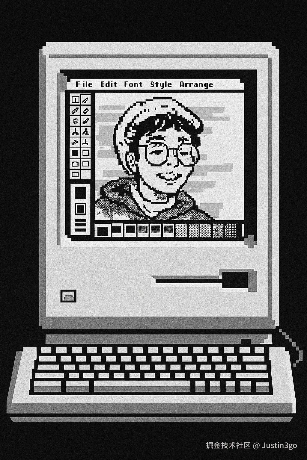 Create an image in pixel art style of an original Macintosh computer with keyboard. On the screen is the uploaded image opened in MacPaint, converted to black and white. ratio is 2:3