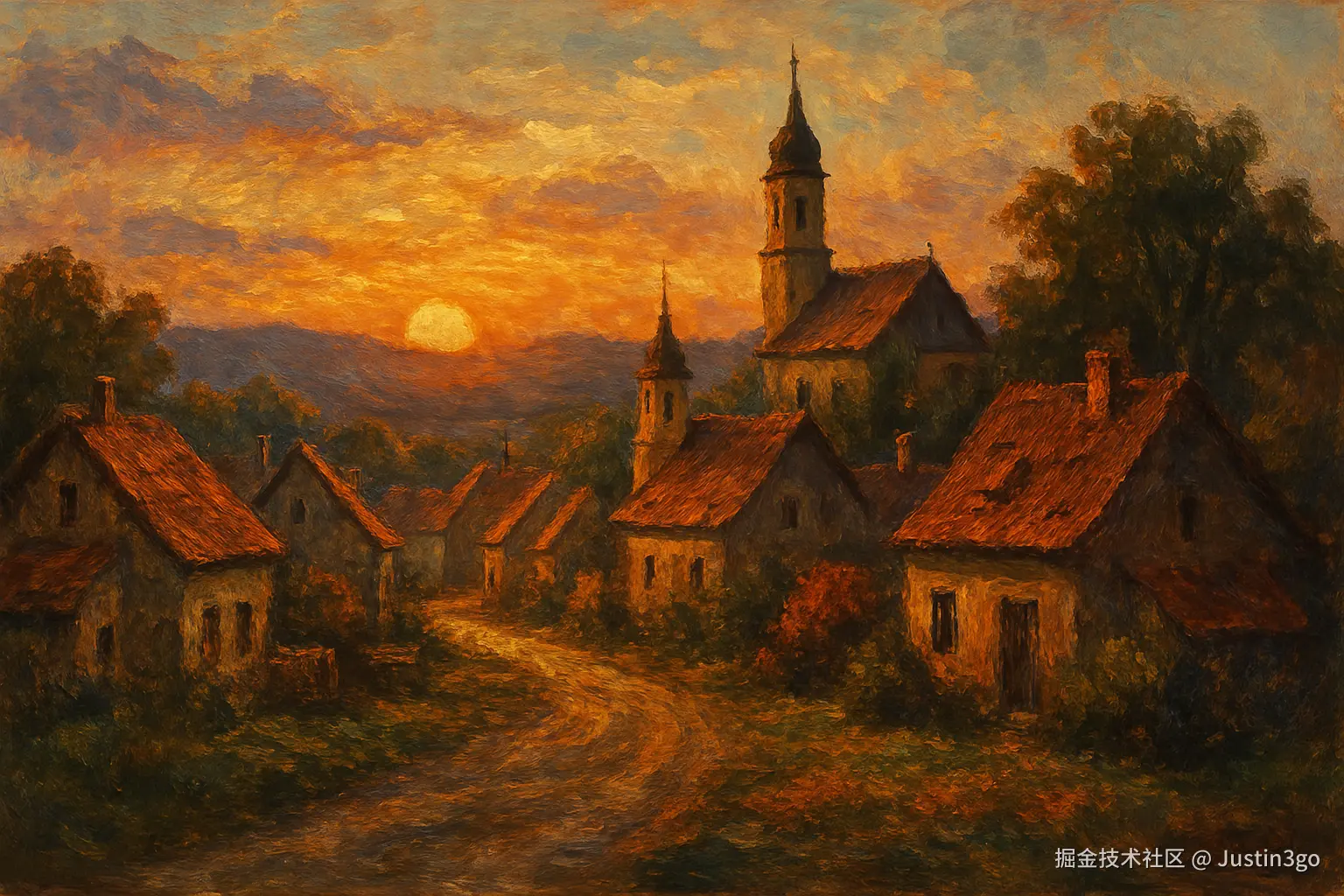 A peaceful European village at sunset, in oil painting style.(日落时分宁静的欧洲村庄,油画风格)