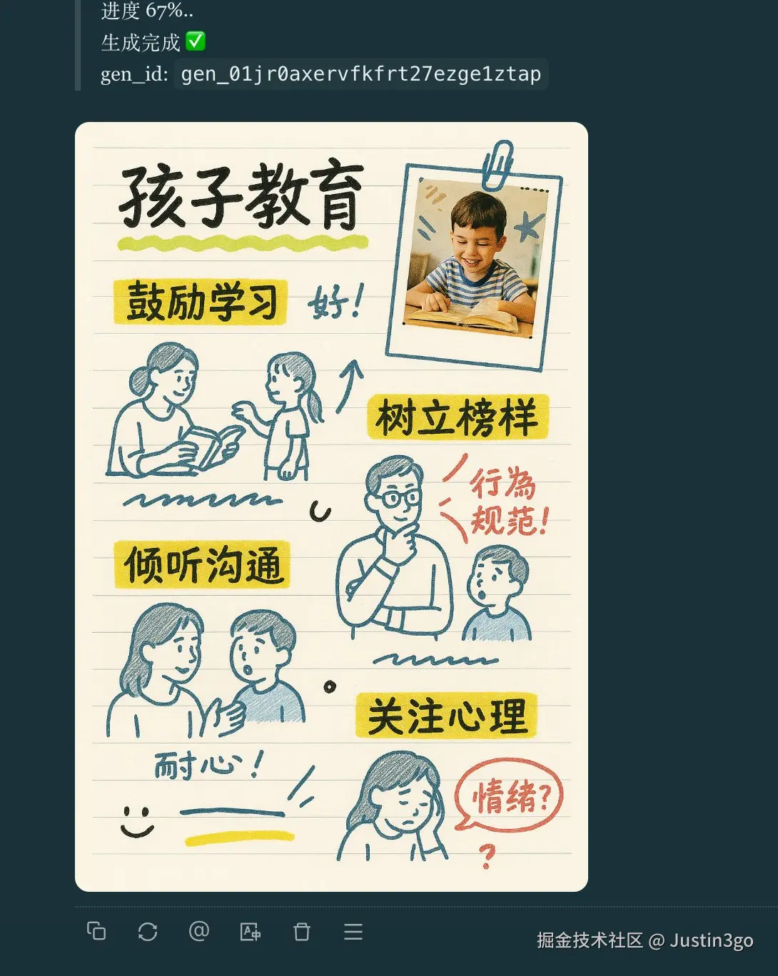 Create concise, visually structured notes on the topic '{{topic}}'. Notes must fit clearly within a {{orientation}} layout (horizontal/vertical), featuring: - Moderate Font Size: Comfortable readability. - Clear Structure: - Main points highlighted with "background colors" or "wavy underlines~". - Regular notes in standard ink. - Emphasis notes in a different ink color. - Illustrations: - Include relevant sketches or hand-drawn style illustrations. - Allow fountain pen-style doodles or annotations directly on illustrations. - Annotations: - Simulate notes, corrections, and additional quirky doodles resembling spontaneous annotations, using marker pen style. - Incorporate collage-style photo extracts relevant to the topic, annotated or doodled upon. - Language Text Accuracy Constraint (Strict): - When generating text in '{{language}}', abide by recognized dictionaries and standard grammar rules. - For languages like 中文 (Chinese) or others with complex scripts: - Ensure each character or symbol is correct, standard, and used appropriately. - Double-check stroke order, avoid non-existent variants, and verify usage before finalizing the notes. User Settings: - Topic: 孩子教育 - Orientation: Vertical - Language: 中文 - Color Scheme: highlight style. - Illustration Style: Detailed hand-drawn