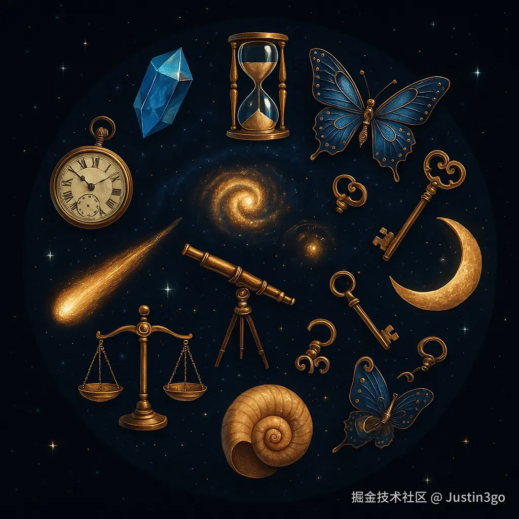 创建一个圆形图像,包含12个对象的螺旋排列,背景为深空,包括水晶沙漏、机械蝴蝶等。