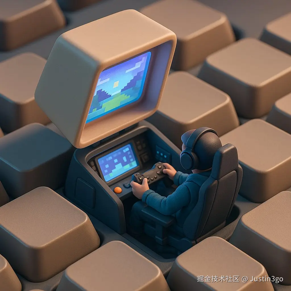 一幅等距3D插画描绘了被掀开的键盘键帽下,一个微型玩家正坐在迷你驾驶舱里打游戏,并将键帽内侧当作发光的屏幕。带有轻微的 3D 质感和些许塑化感,使整个场景如同一个为游戏玩家量身定做的、极其精巧的立体模型。