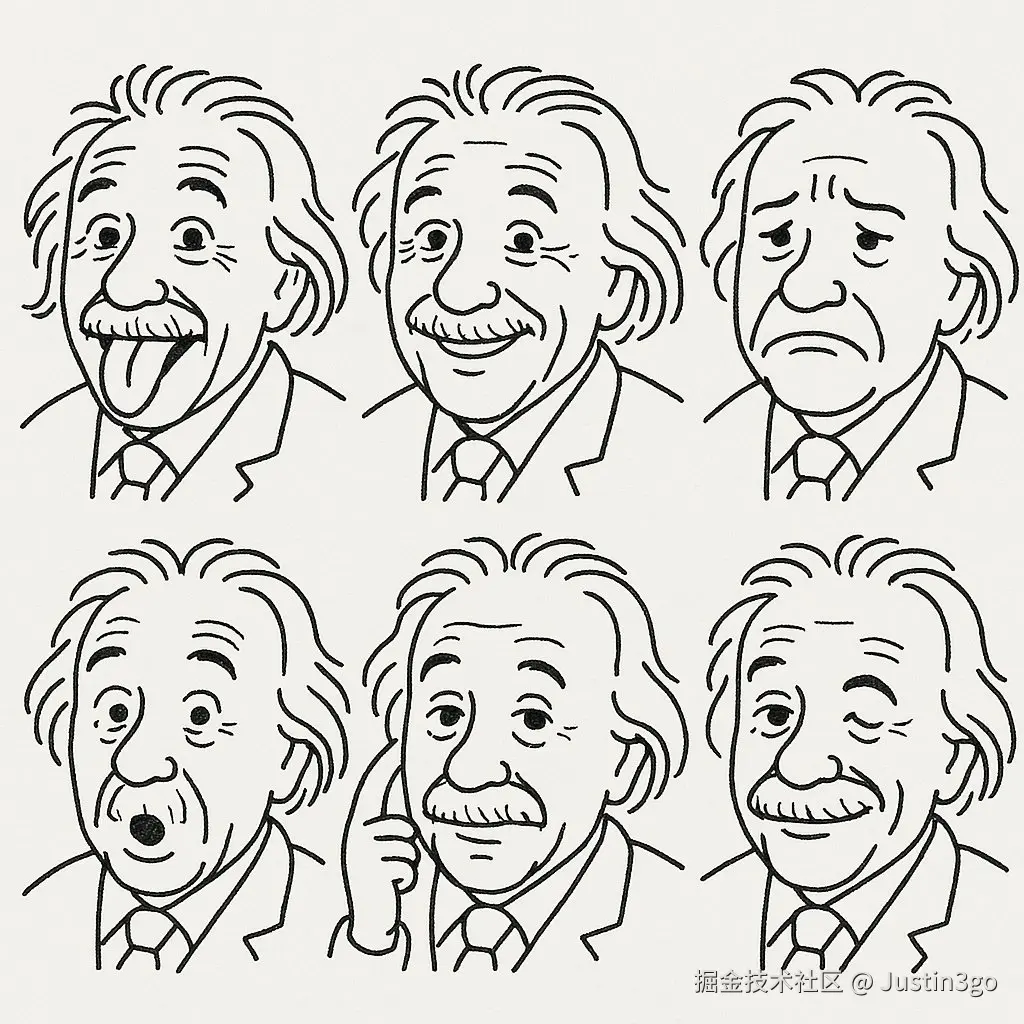 先把图片人物变成手绘简笔画风格 然后把简笔画按照吐舌头、微笑、皱眉、惊讶、思考、眨眼生成一系列表情包