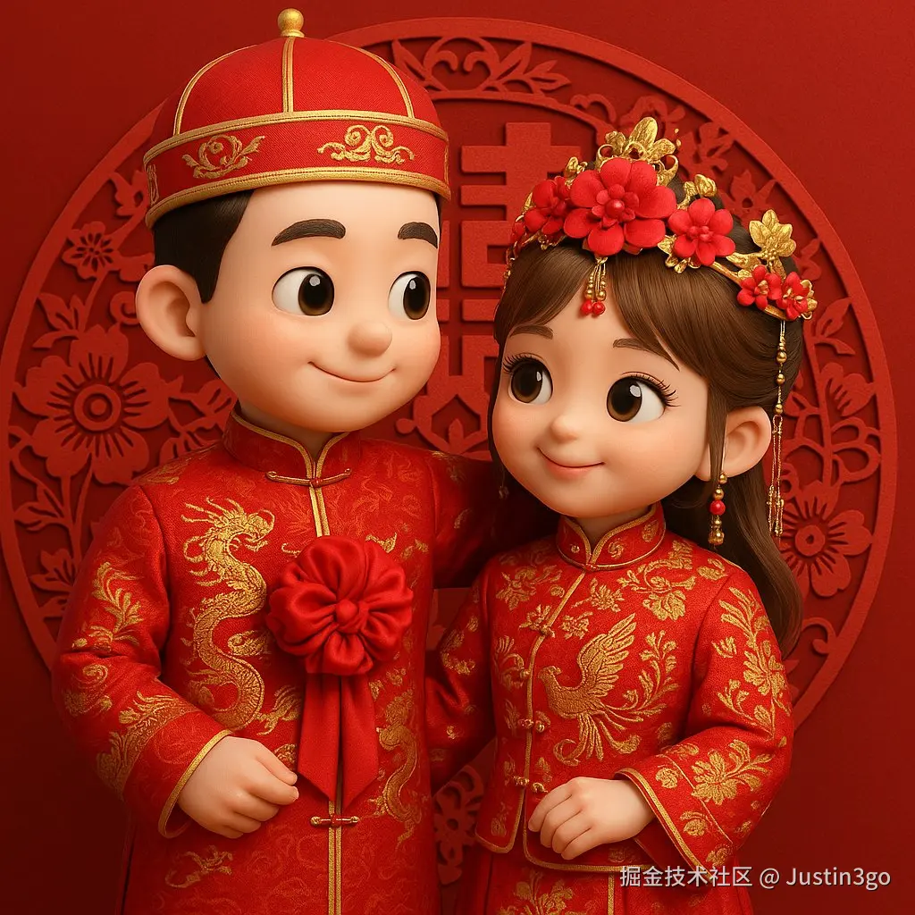 将照片里的两个人转换成Q版 3D人物,中式古装婚礼,大红颜色,背景“囍”字剪纸风格图案。 服饰要求:写实,男士身着长袍马褂,主体为红色,上面以金色绣龙纹图案,彰显尊贵大气 ,胸前系着大红花,寓意喜庆吉祥。女士所穿是秀禾服,同样以红色为基调,饰有精美的金色花纹与凤凰刺绣,展现出典雅华丽之感 ,头上搭配花朵发饰,增添柔美温婉气质。二者皆为中式婚礼中经典着装,蕴含着对新人婚姻美满的祝福。 头饰要求: 男士:中式状元帽,主体红色,饰有金色纹样,帽顶有精致金饰,尽显传统儒雅庄重。 女士:凤冠造型,以红色花朵为中心,搭配金色立体装饰与垂坠流苏,华丽富贵,古典韵味十足。