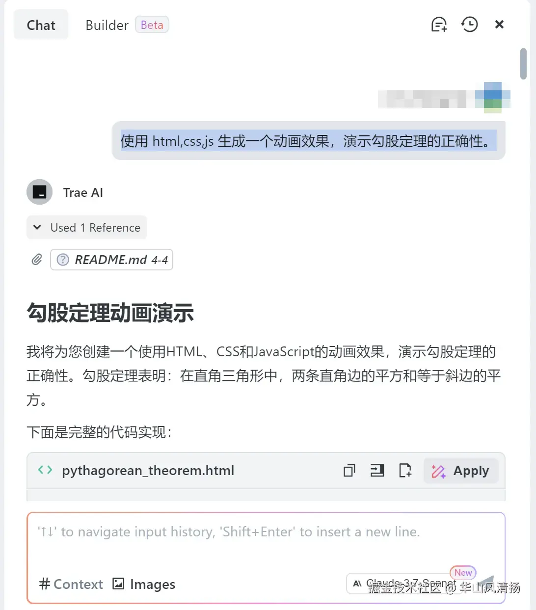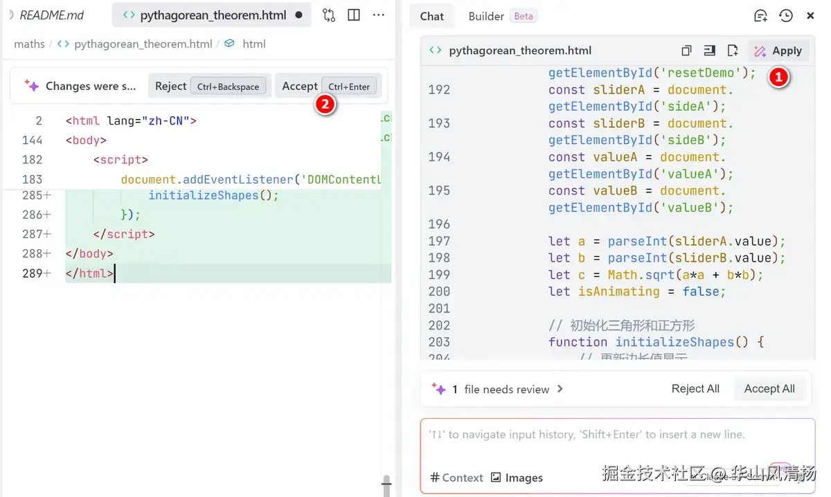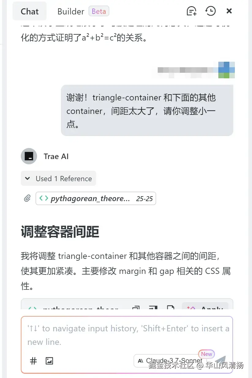 虽然我是一个后端开发人员,对前端几乎一窍不通,但是有了 Trae 的助力,我也能毫不费力的完成 html 的编写,让我儿子对勾股定理有一个更直观的感受。