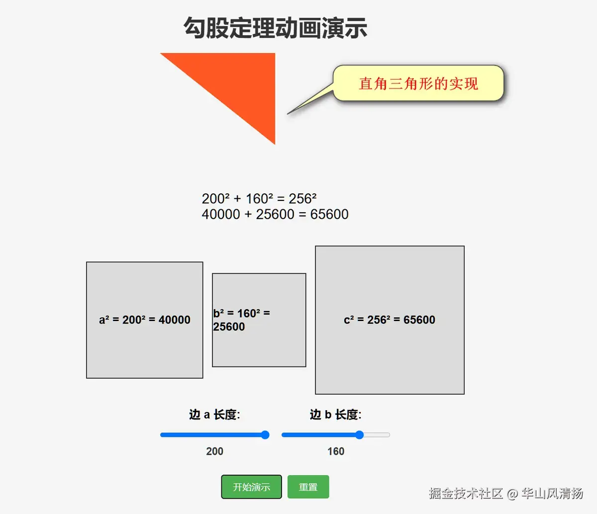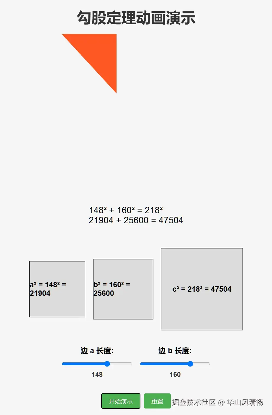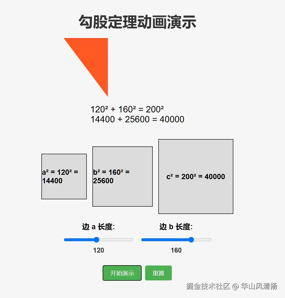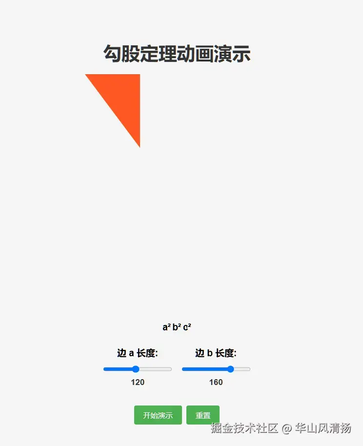 执行完毕后,我们双击 html,看看效果。Trae 帮我们设计了两个滑动 Input 字段,左右拖放可以调整直角三角形两条直角边的长度。点击开始演示,能看到直角边进行乘方运算,然后求和的动画效果。