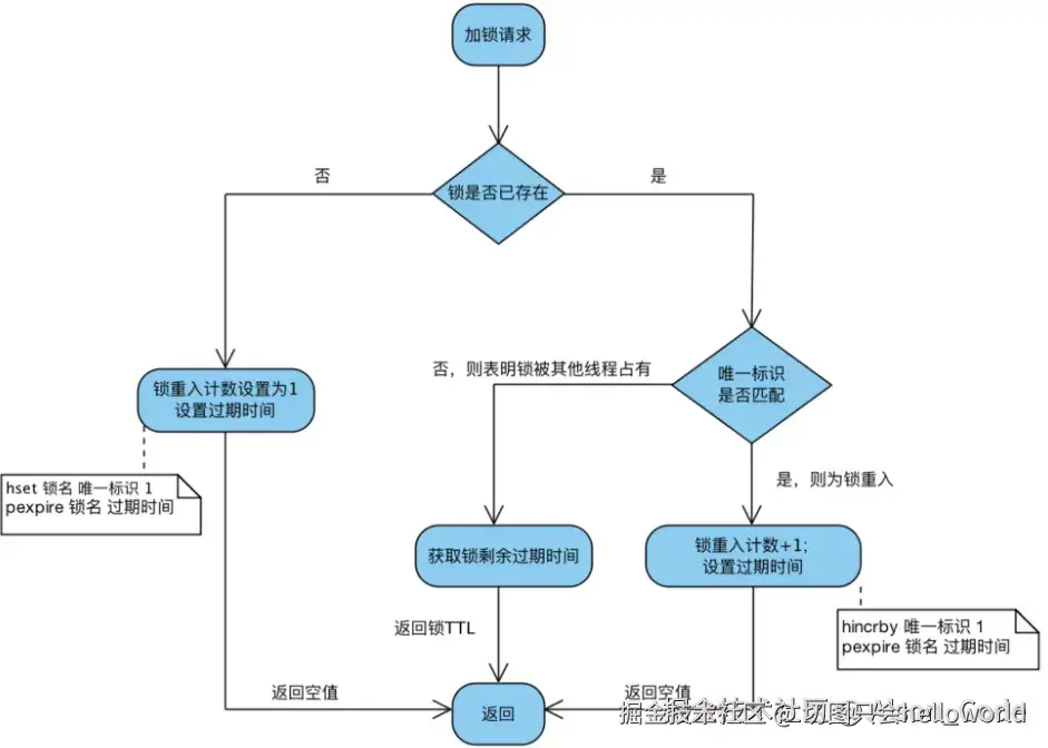- 加锁时使用requestId避免其他线程释放锁,比如A获取锁后因业务逻辑没有执行完就到了过期时间释放了锁,B获取到锁后刚开始执行,A执行结束就把锁释放了,增加requestId后,可以先查询在判断是否可以释放,因为分了两步所以需要使用lua脚本保证原子性;