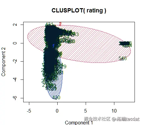 然后绘制聚类散点图,通过聚类图,我们可以看到真实评论和虚假评论明显地被分成了两个聚类簇。