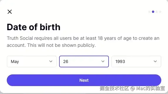 然后输入你的生日,需要年满18岁才能使用TruthSocial的服务,如图: