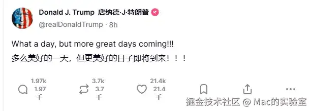 Trump在其自家的社交媒体上似乎更活跃,跟我们发朋友圈差不多,比如最新的这条: