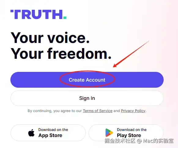 打开平台网址:truthsocial.com/,点击“Create Account”,如图: