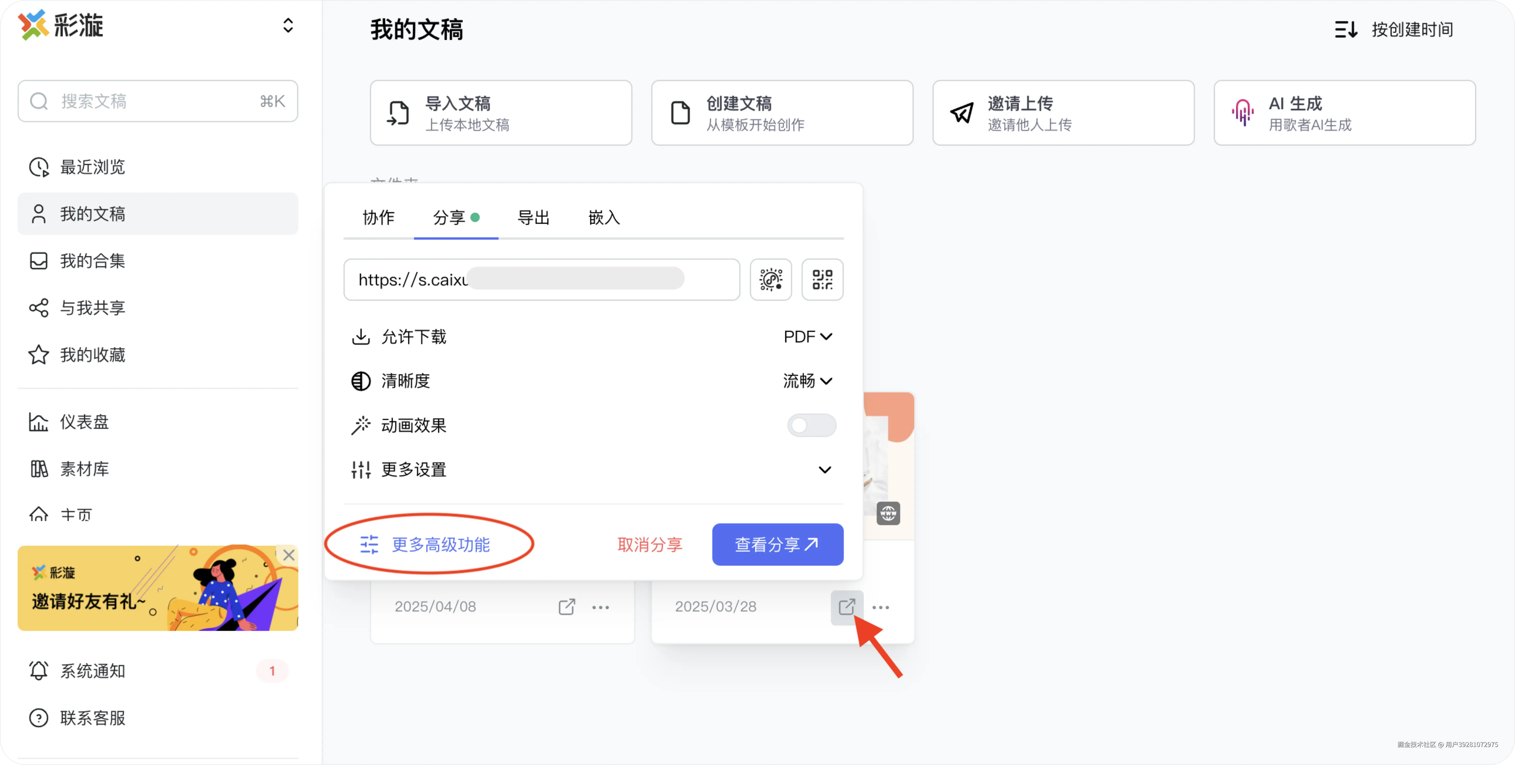 Step 1:打开彩漩PPT,找到目标文稿,点击「分享」开启文稿分享后,进入「更多高级功能」