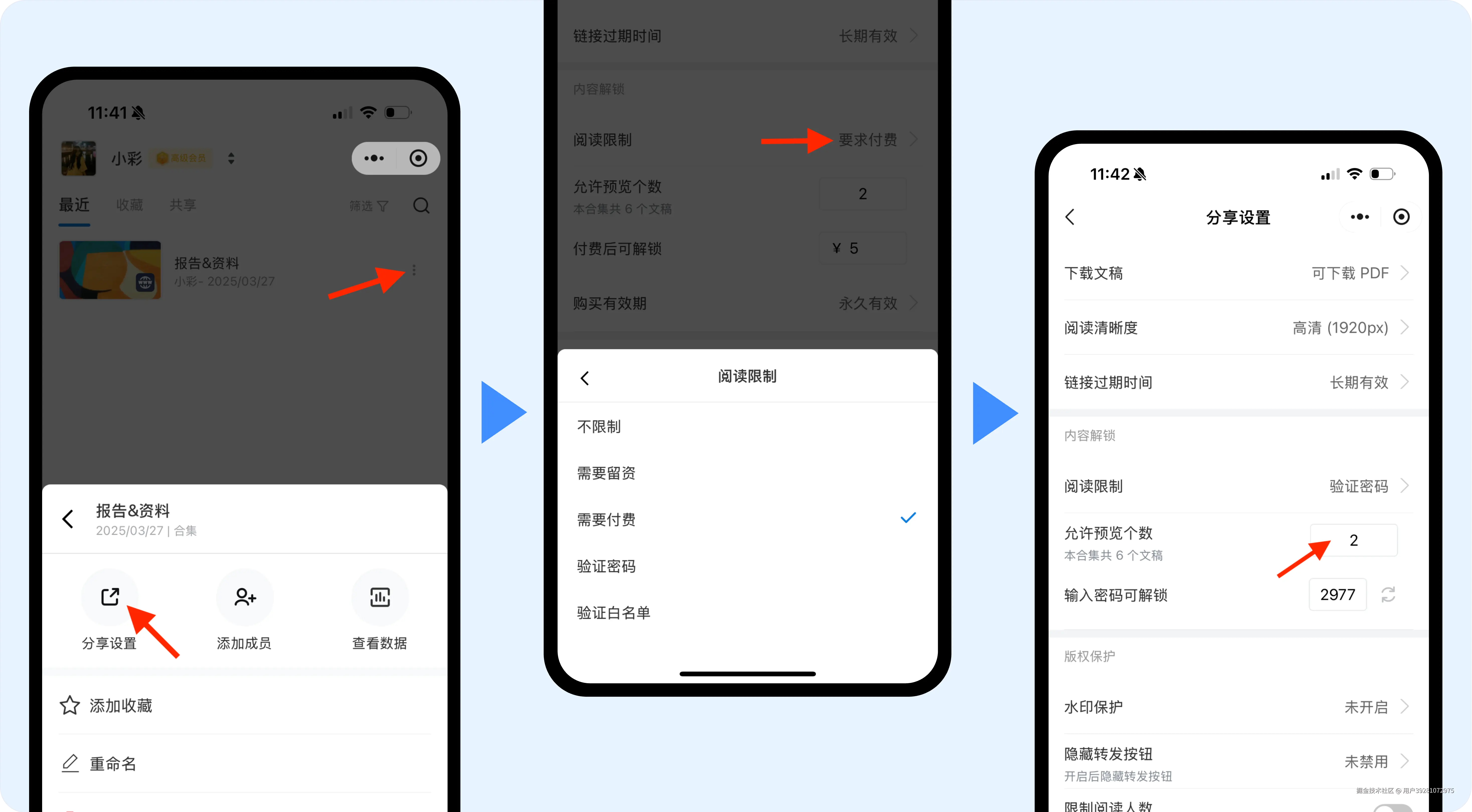 Step 2:在「阅读限制」中选择门槛类型(如留资、收费等),每种方式都支持设置可预览的文稿数量,设置完保存即可