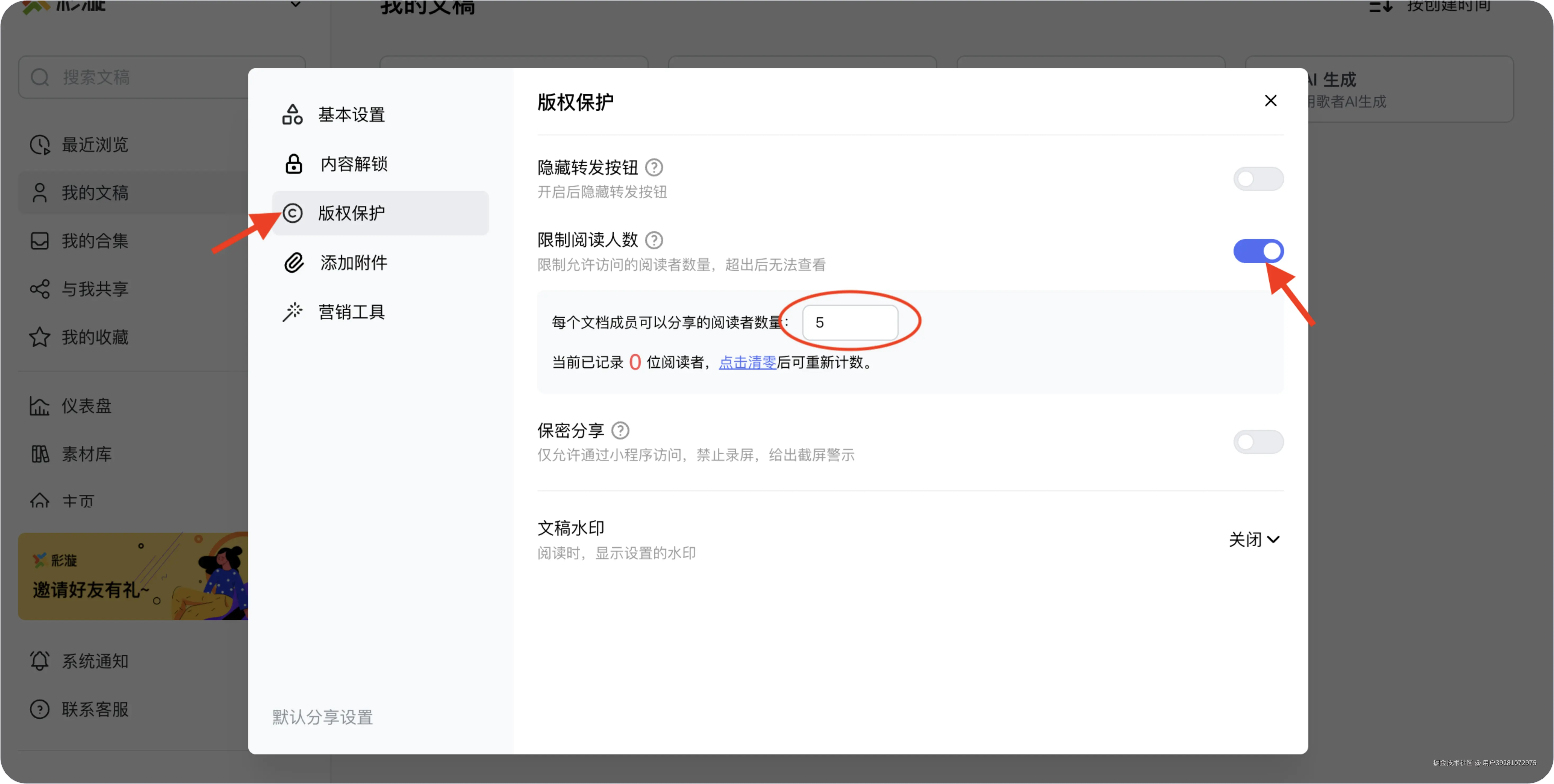 Step 2:在「版权保护」中开启「限制阅读人数」,并设置允许的阅读者数量,保存设置即可