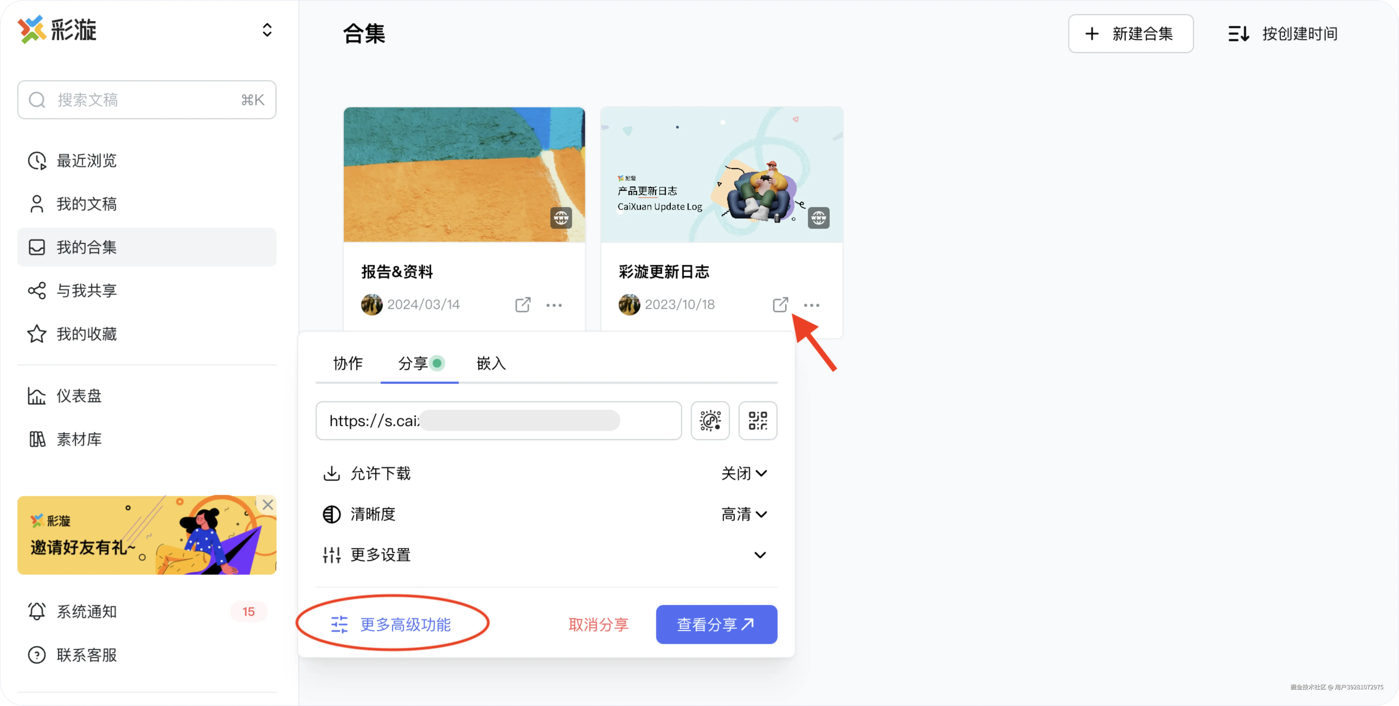Step 1:创建好合集后,开启分享,点击「更多高级功能」