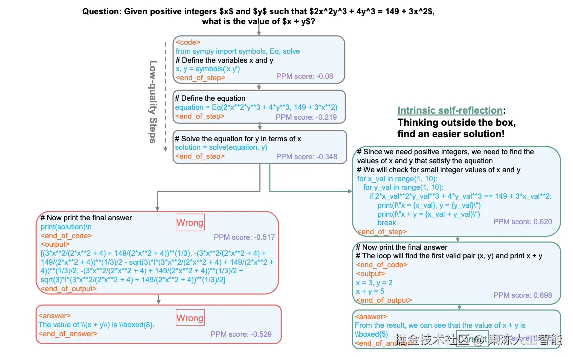 图4:rStar-Math深度思考过程中,内在自我反思的一个例子。