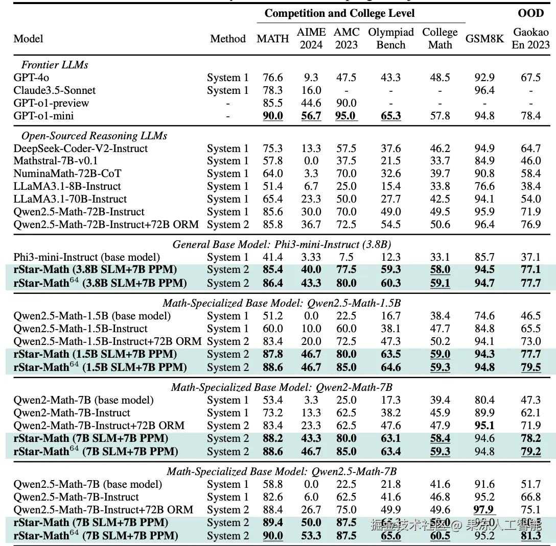 表5:rStar-Math和其他前沿LLM在最难数学基准测试中的表现。rStar-Math64表示每个题目采样64条推理轨迹时的Pass@1准确率。