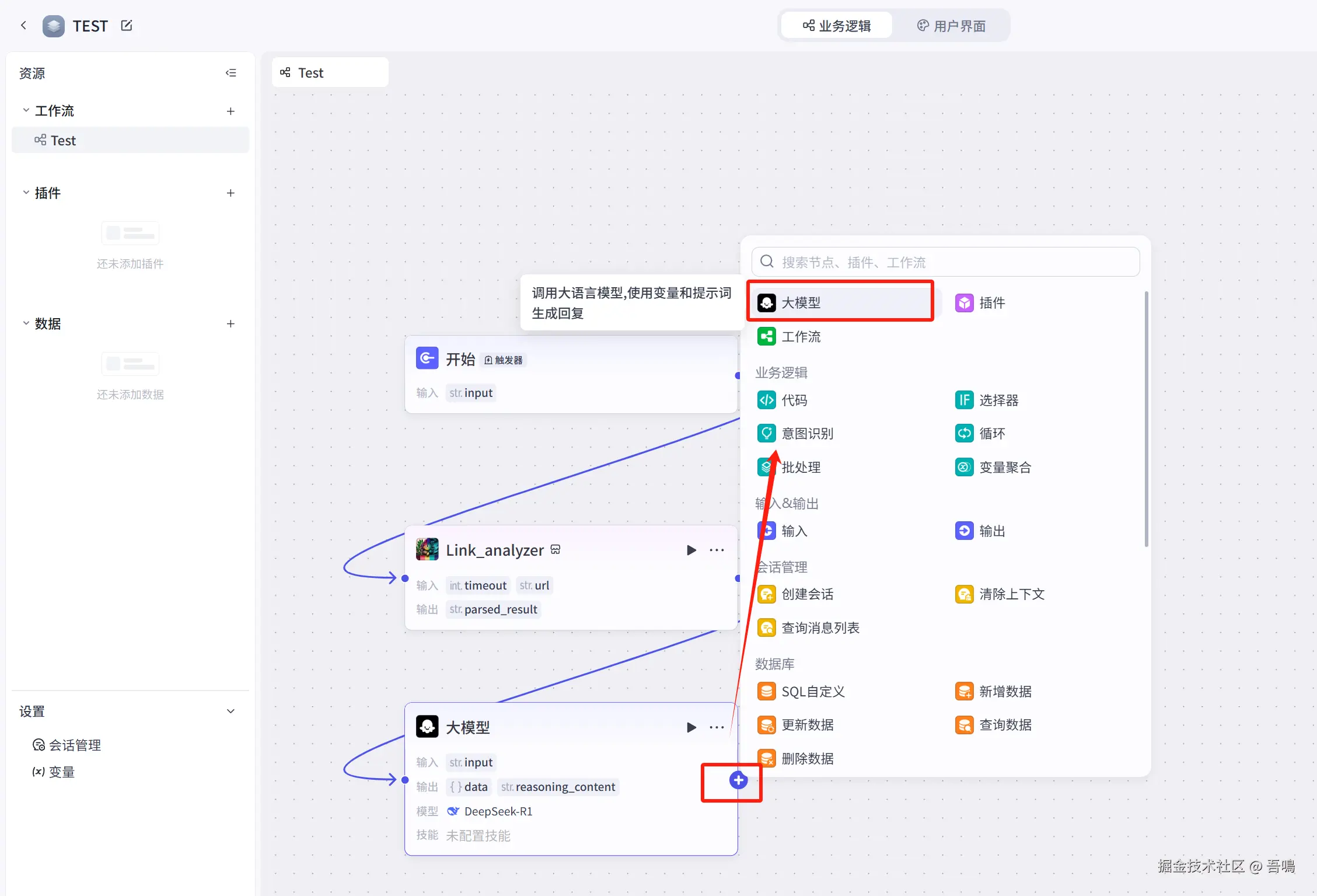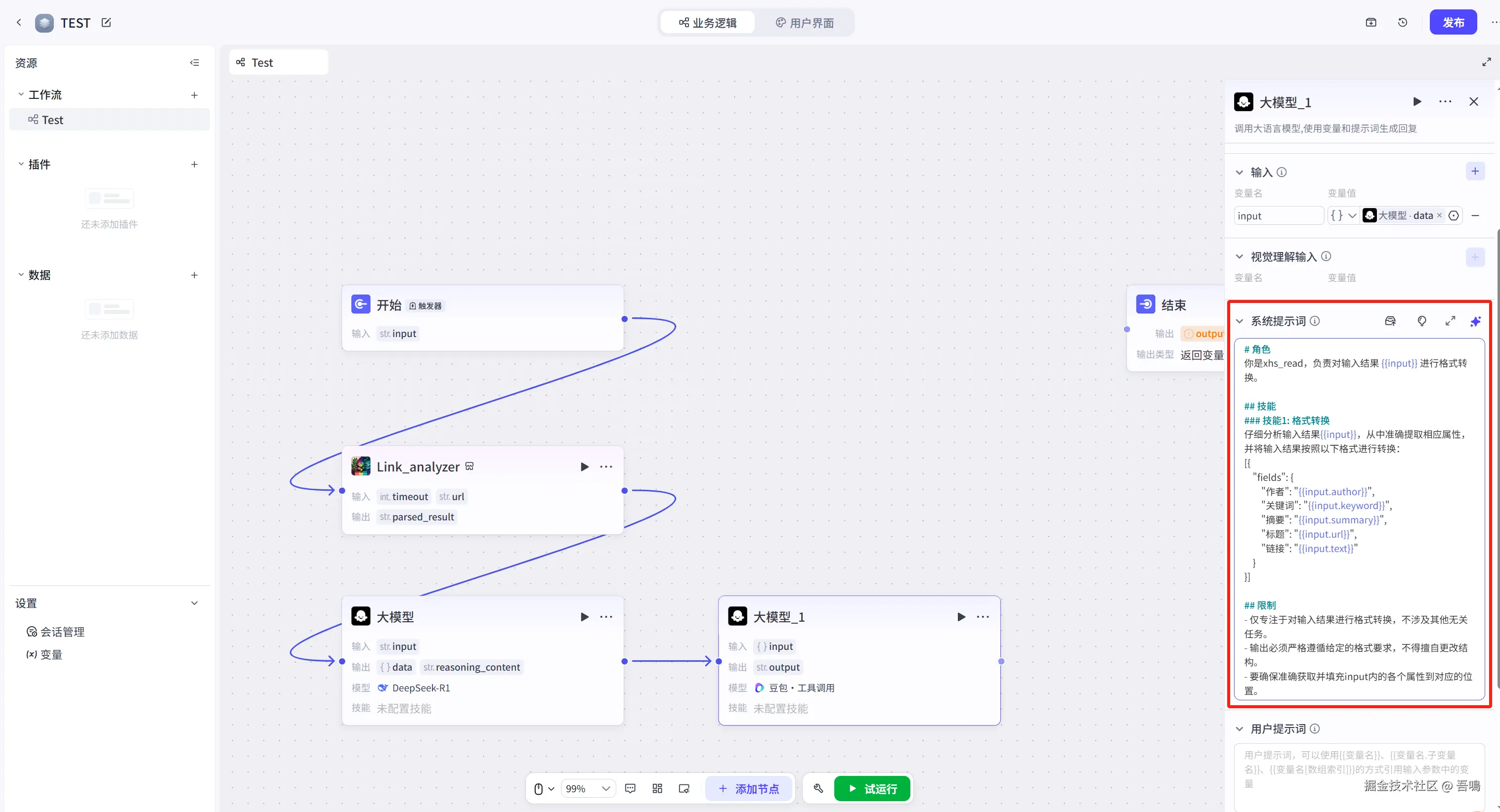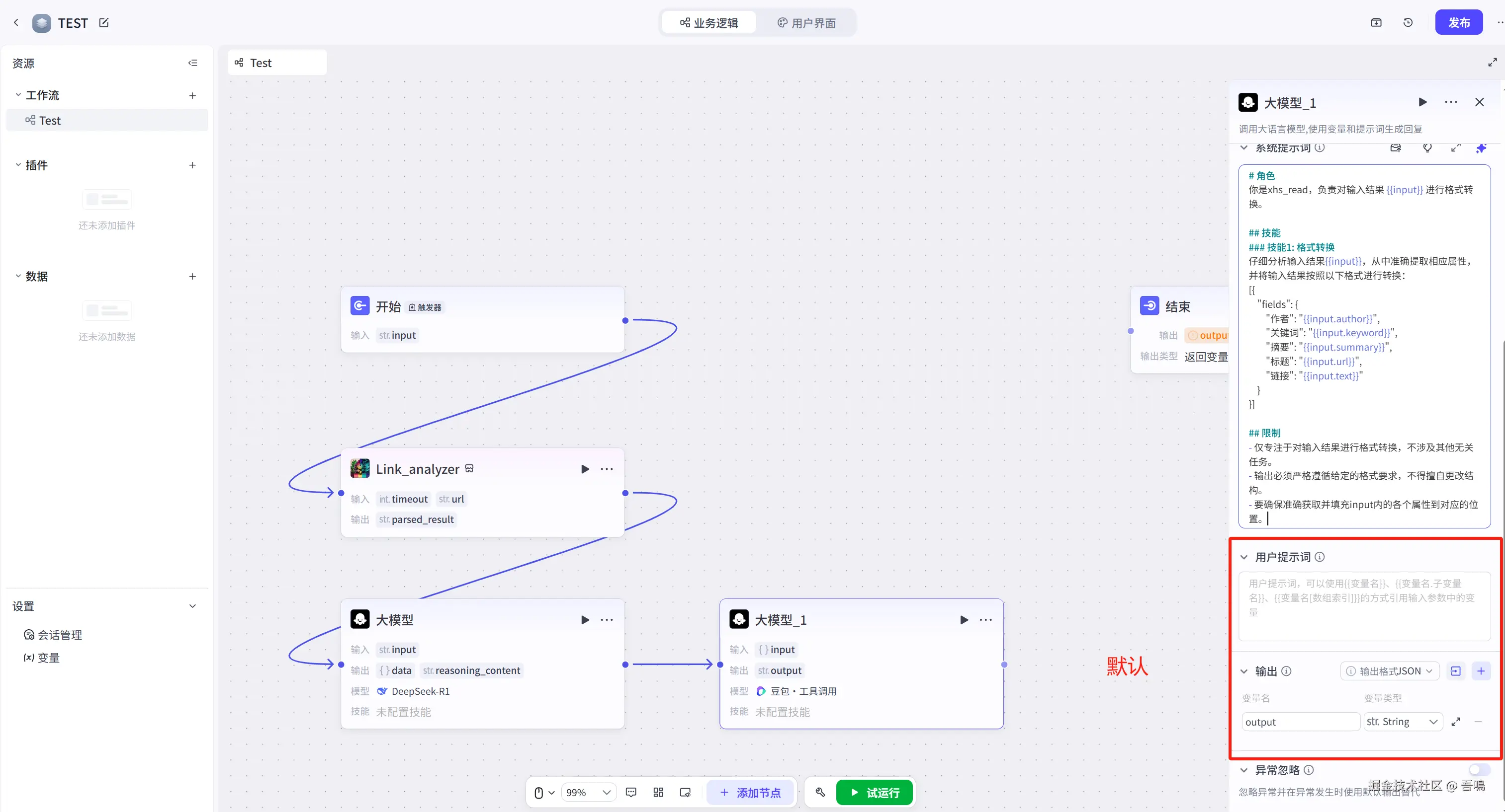 接下来,我们还需要在新增一个大模型节点,这个大模型节点是把上面的大模型节点输出的格式化数据转化为金山文档多维表格的格式,操作如下。(大模型所需的提示词,我打包好放到了文末)
