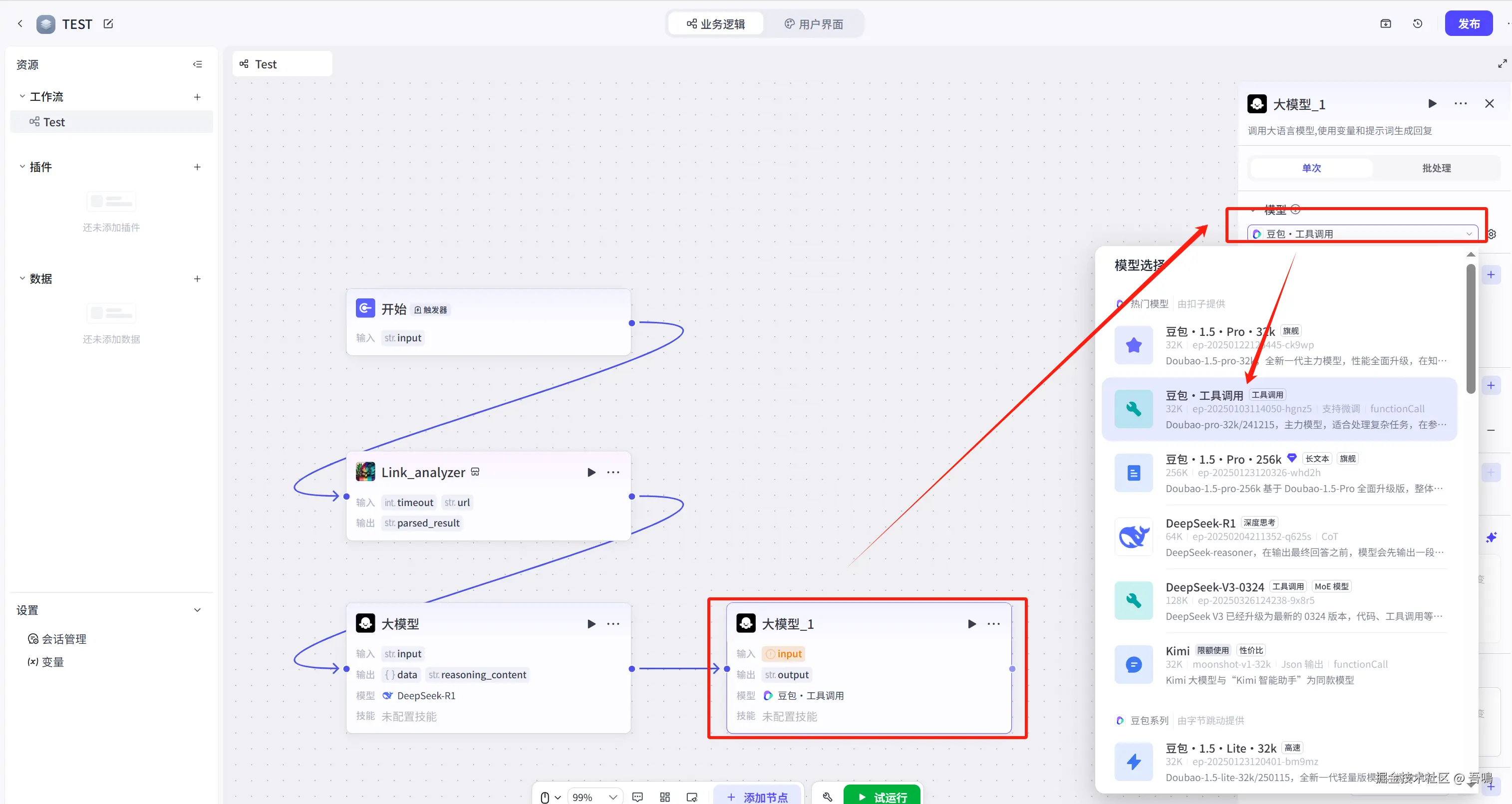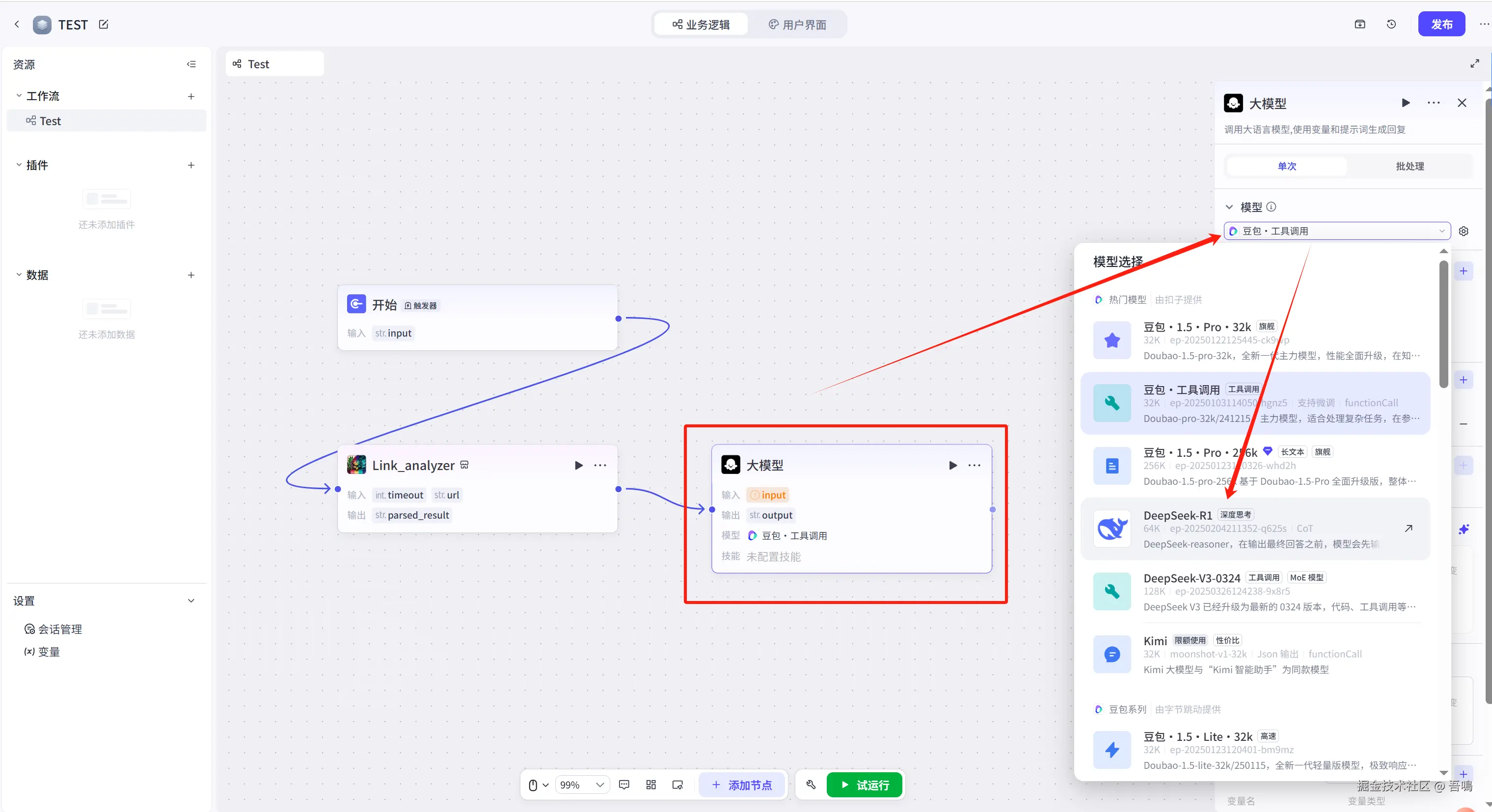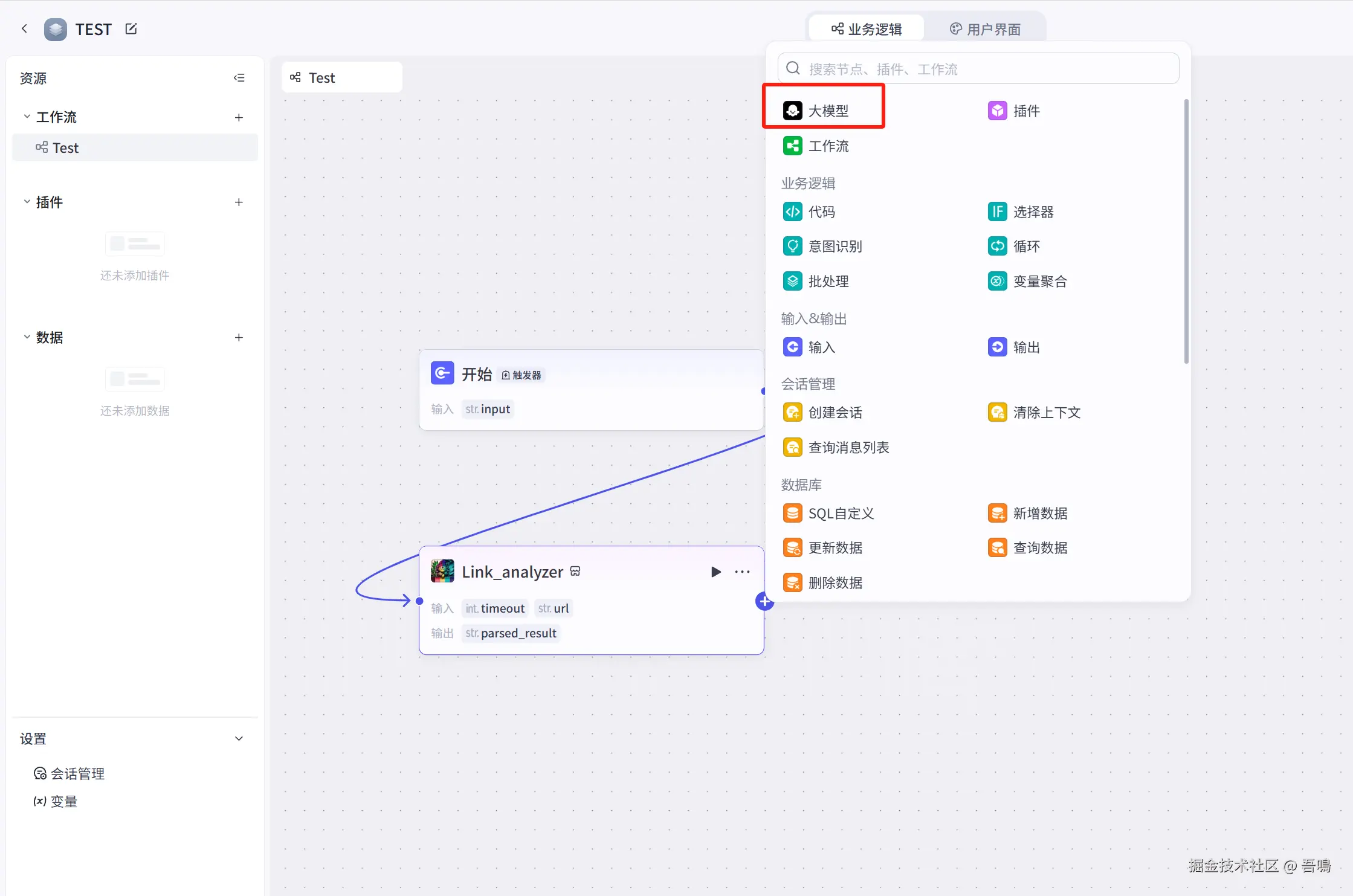 接下来,我们还需要在新增一个大模型节点,这个大模型节点是把上面的大模型节点输出的格式化数据转化为金山文档多维表格的格式,操作如下。(大模型所需的提示词,我打包好放到了文末)