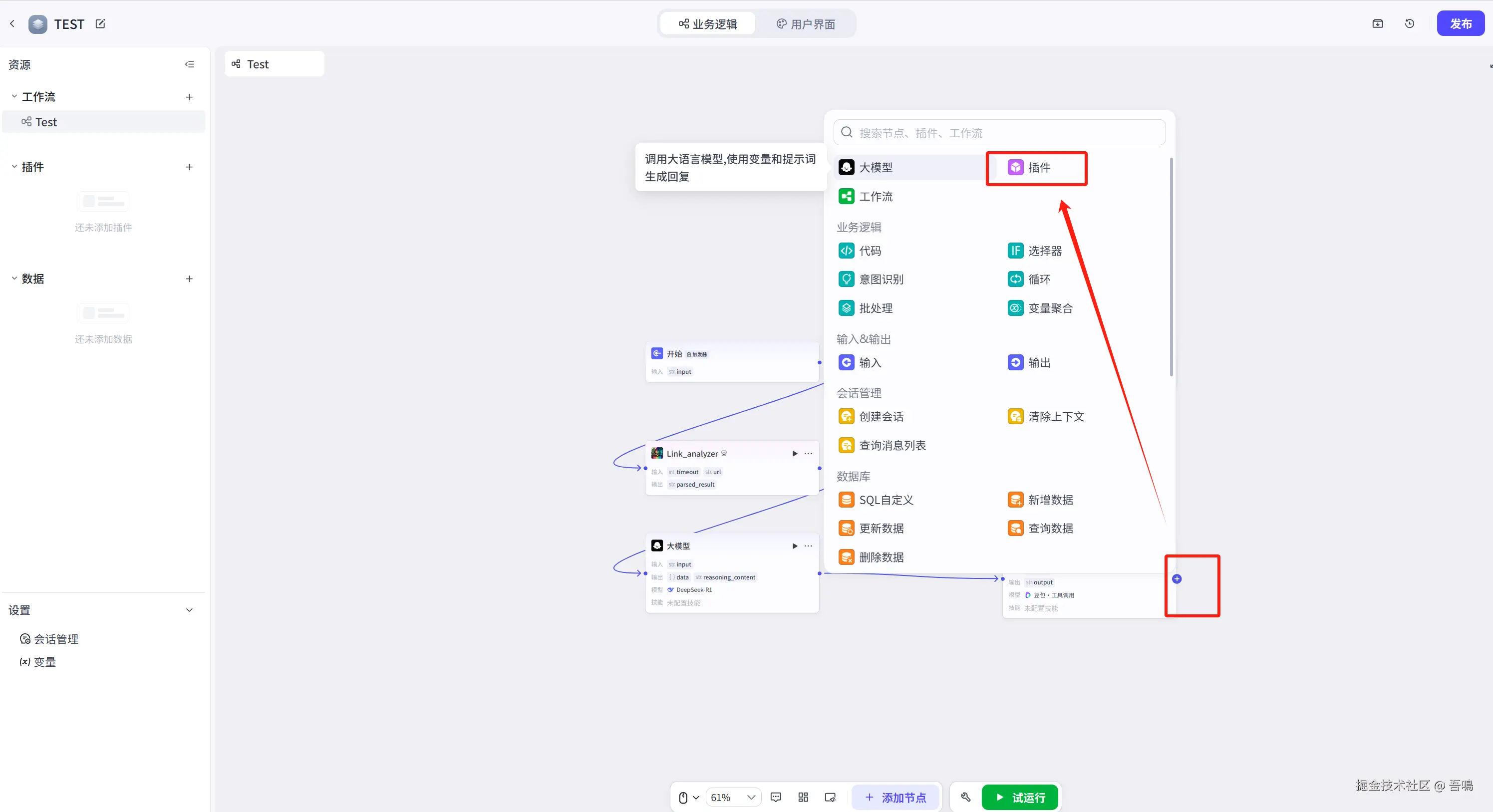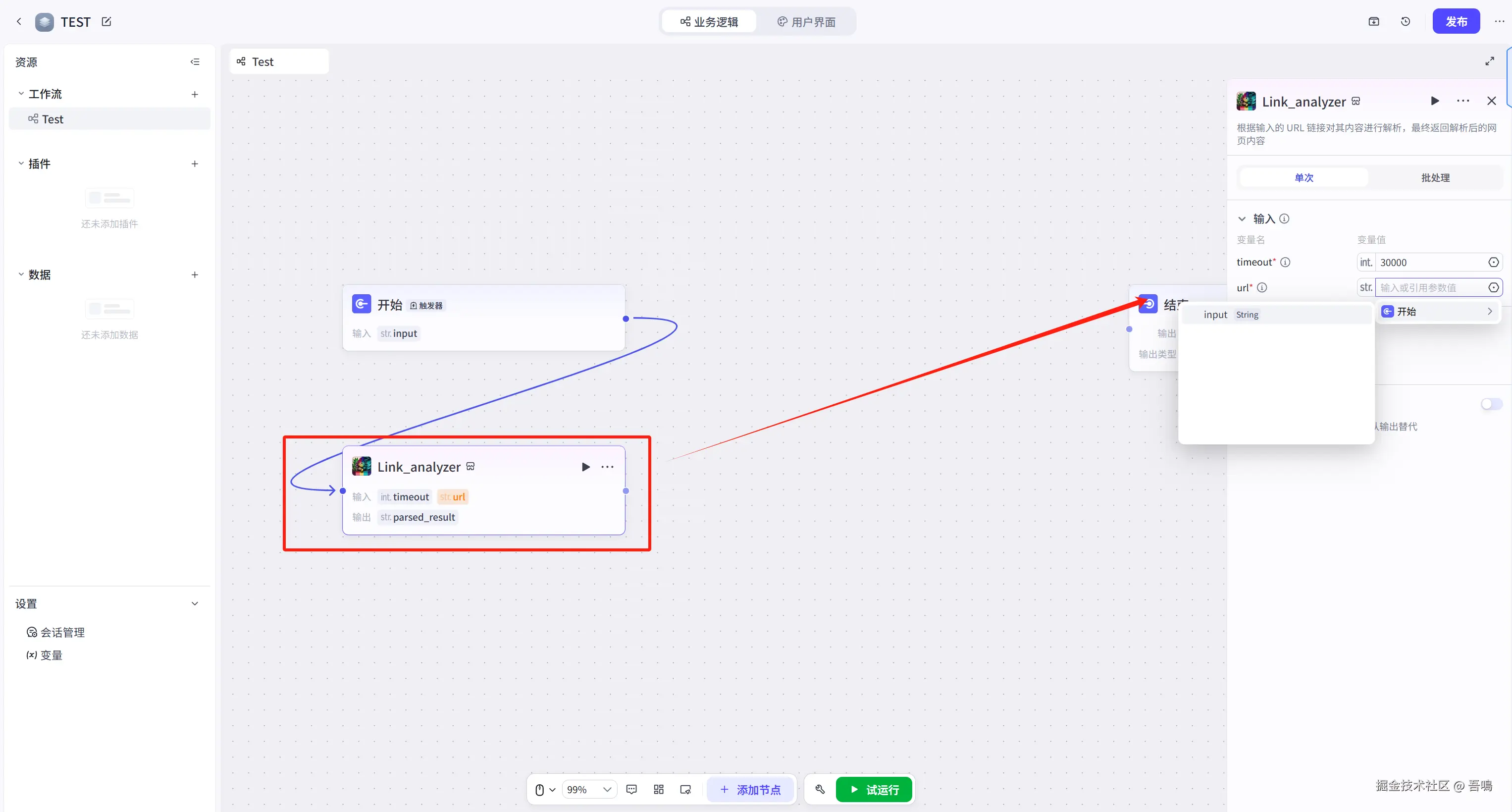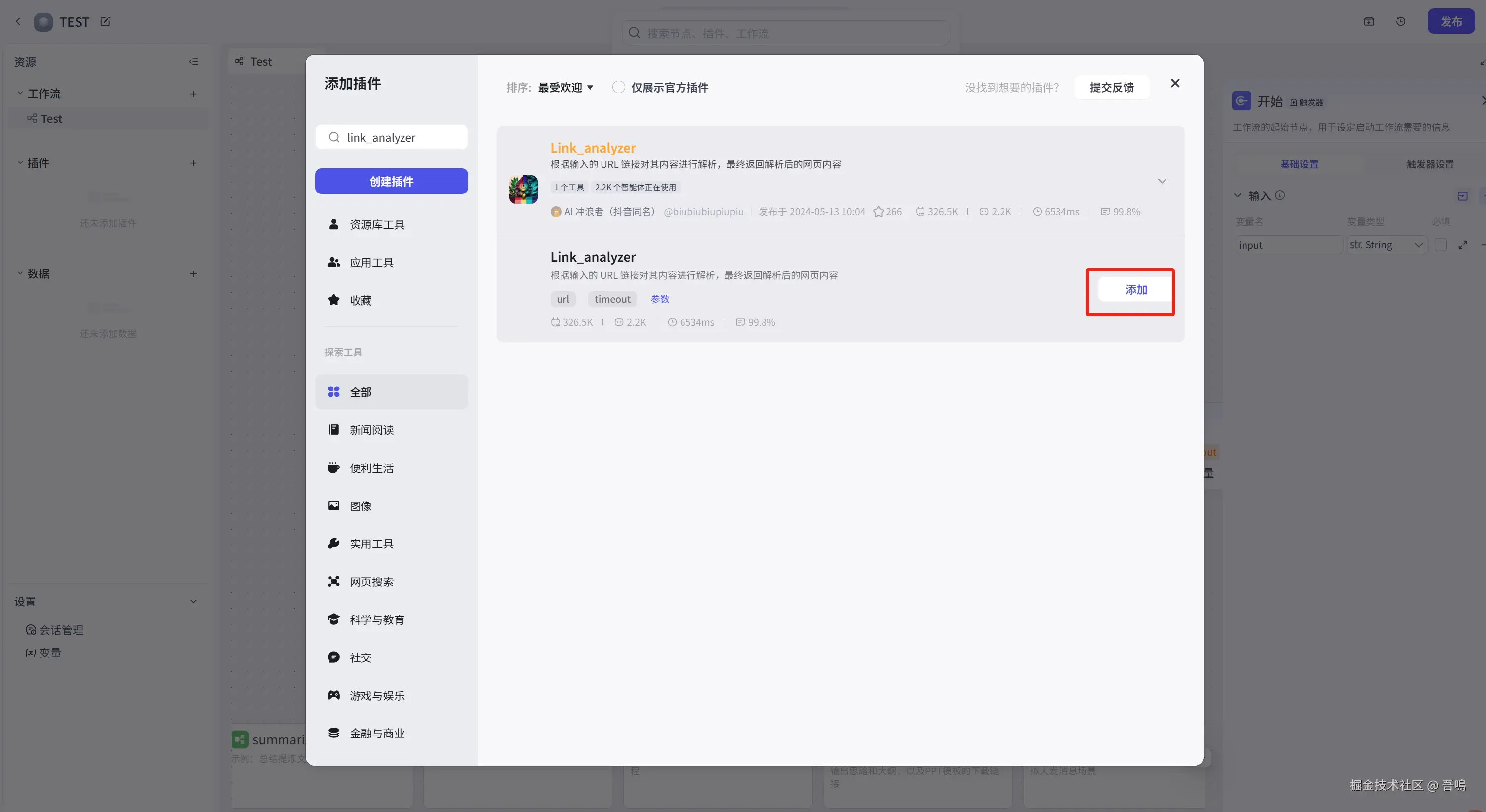 在开始节点后面添加获取笔记内容节点,点击开始节点最右边的的加号,就可以开始新加节点。我们选择插件,然后搜索link_analyzer插件,点击添加插件。这个插件有两个参数,分别是timeout(超时,单位毫秒)和 url(网页地址),这个就选择开始节点的输入参数即可。配置步骤如下图所示。