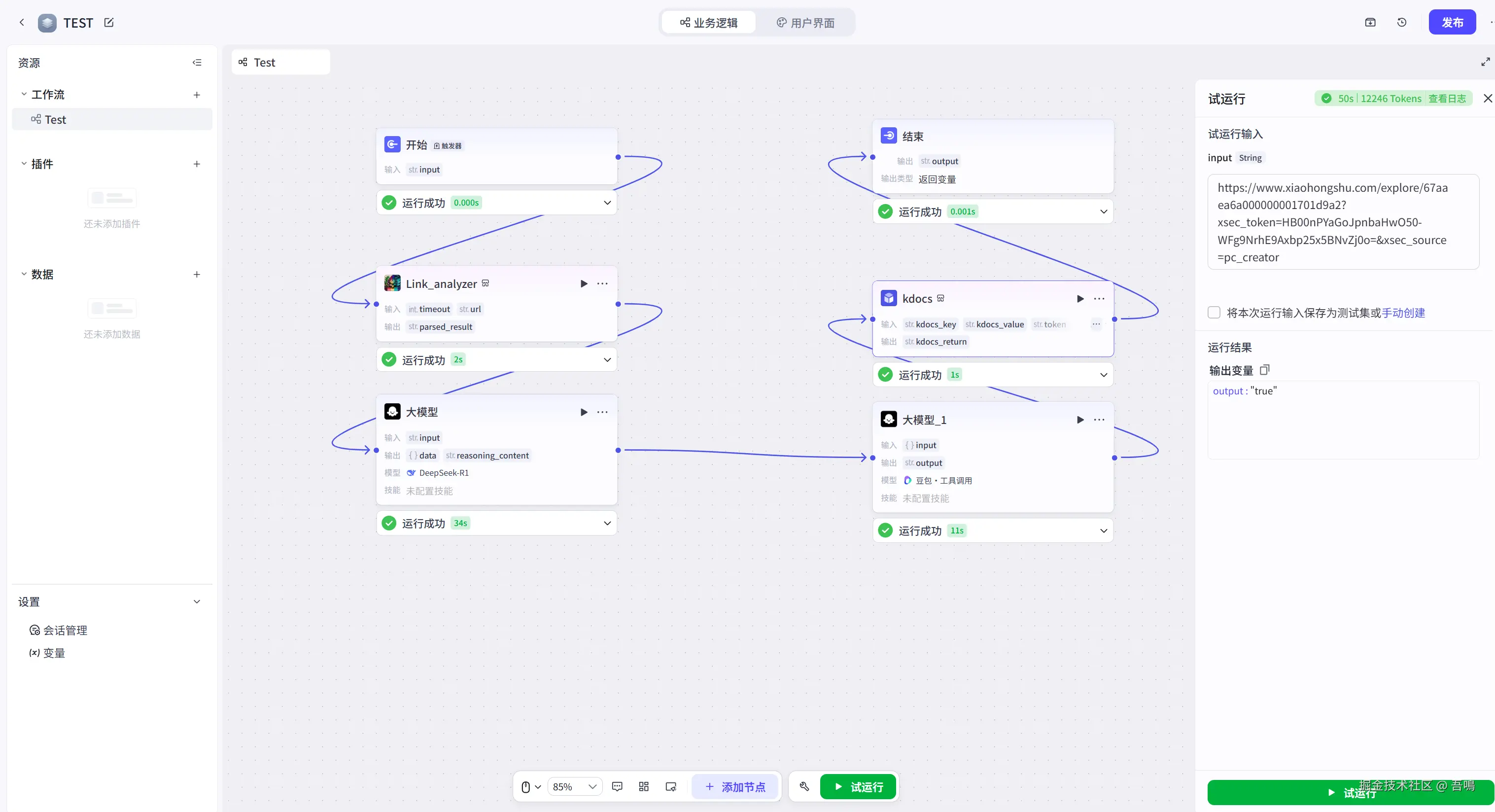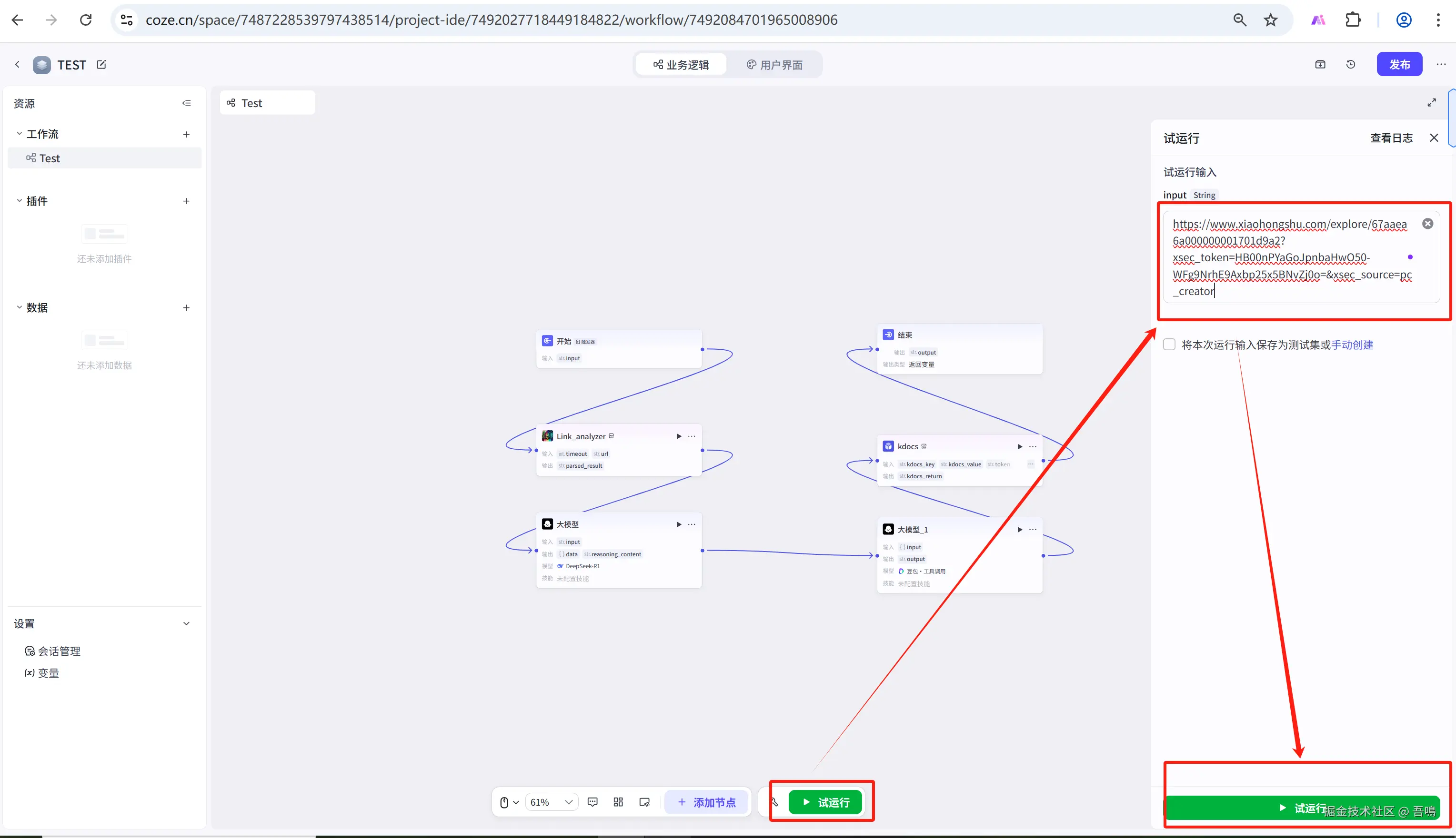搭建好工作流之后,我们可以找一个小红书的笔记链接,然后点击工作流下方的试运行按钮,把笔记链接输入到输入框中,点击试运行即可。如果所有节点运行完,并且都成功,且金山文档能看到新增的笔记分析数据,那么就说明工作流建成功了。