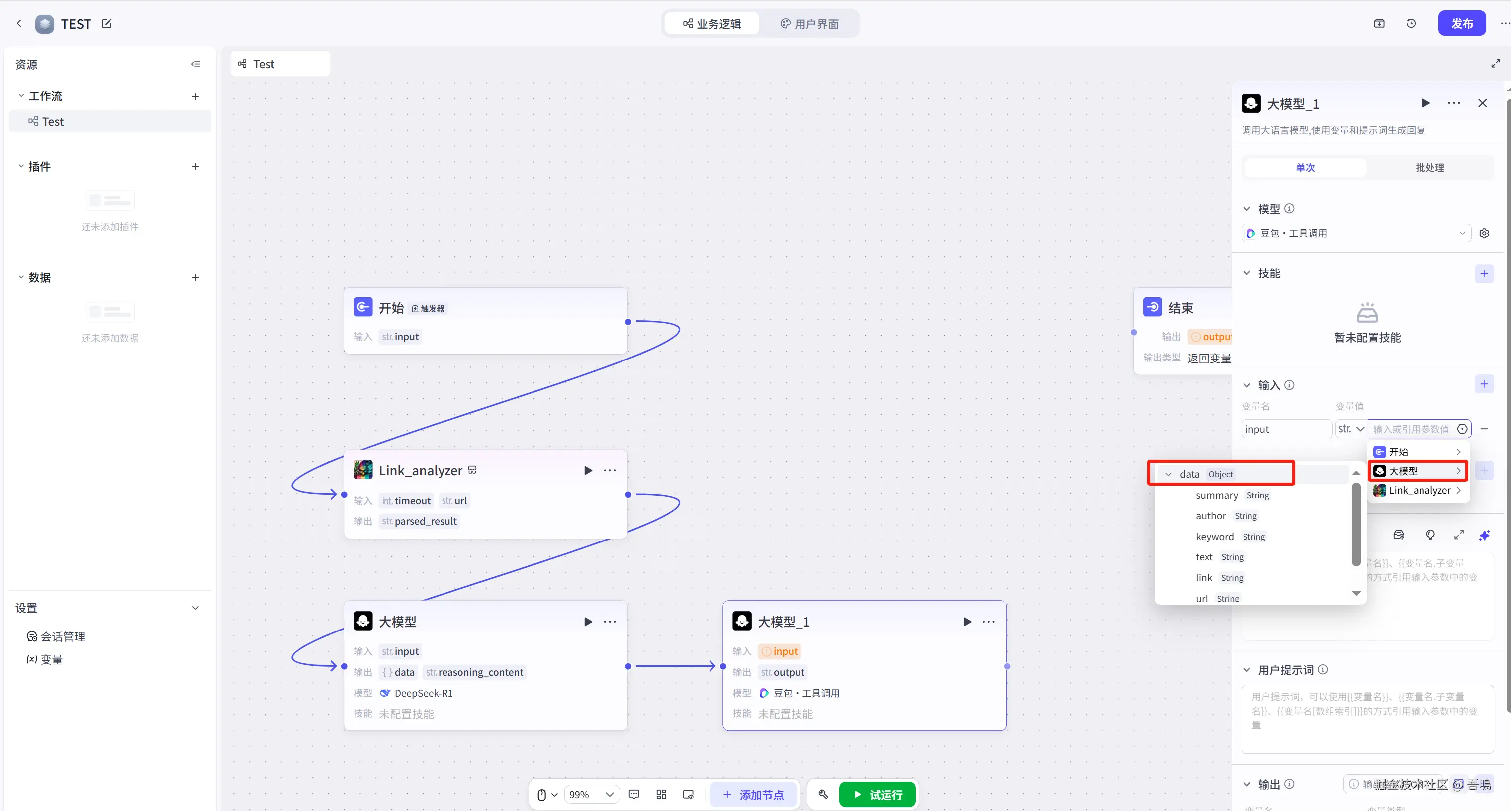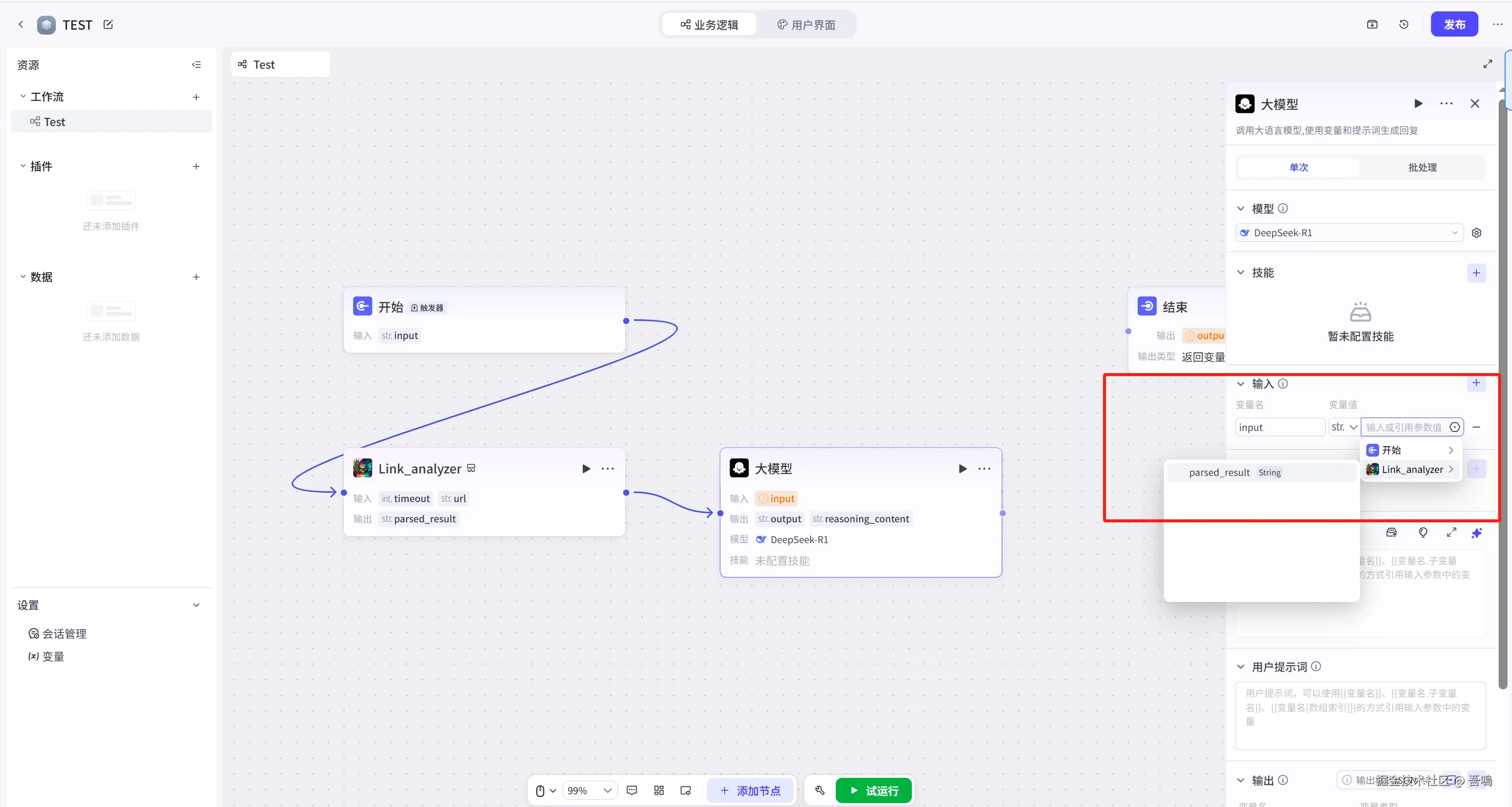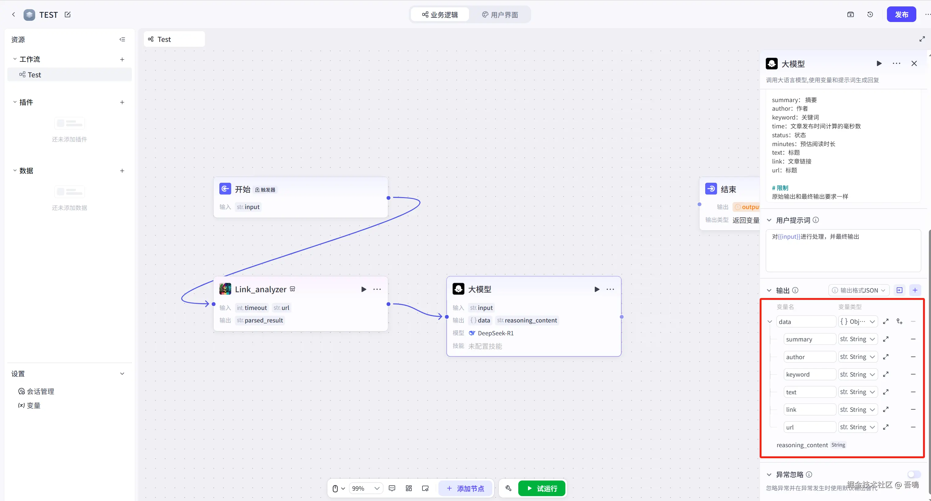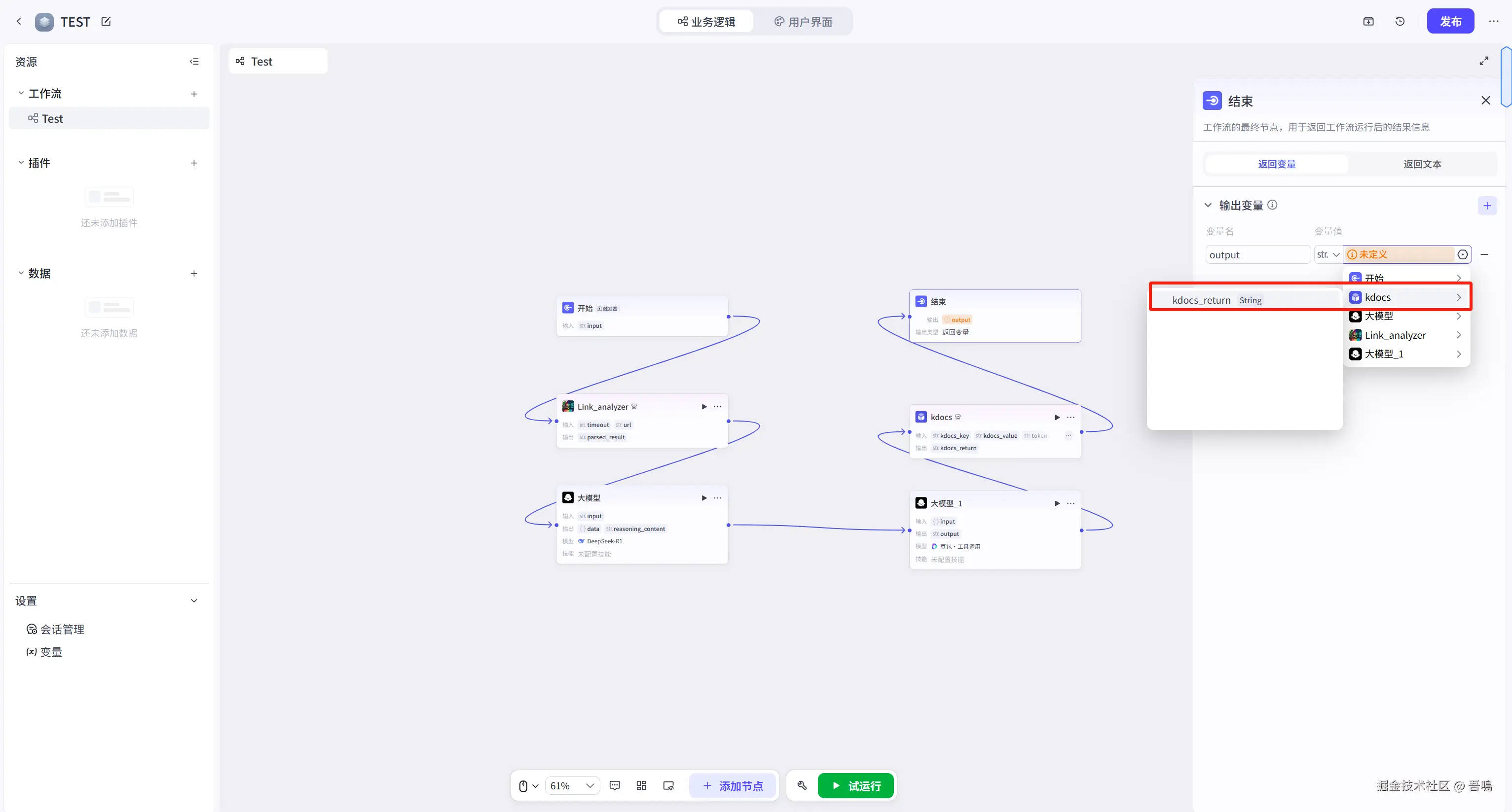 最后把最后一个节点的连线与结束节点连上即可,并且修改结束节点的输入参数,修改完之后,整个工作流就搭建完成了。