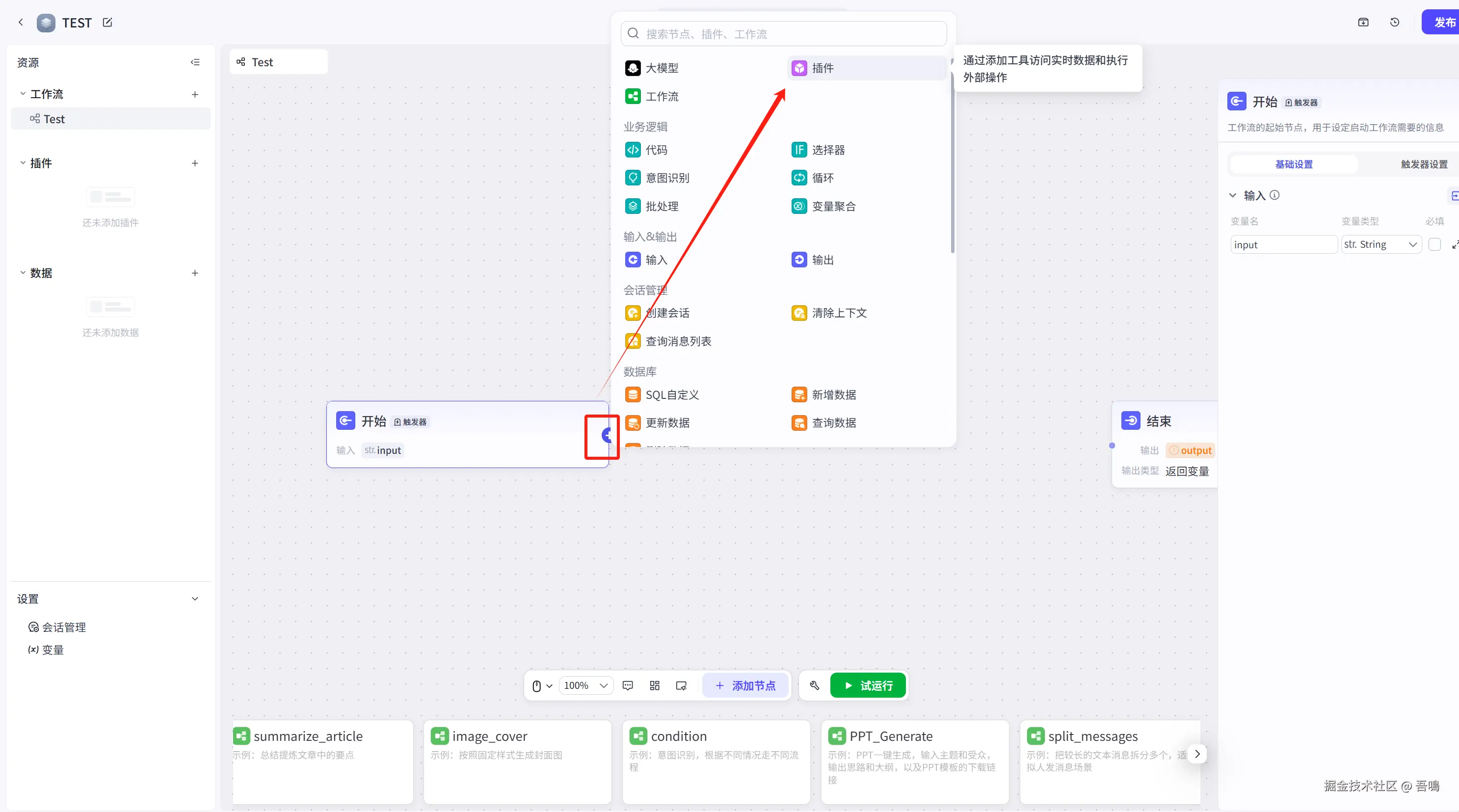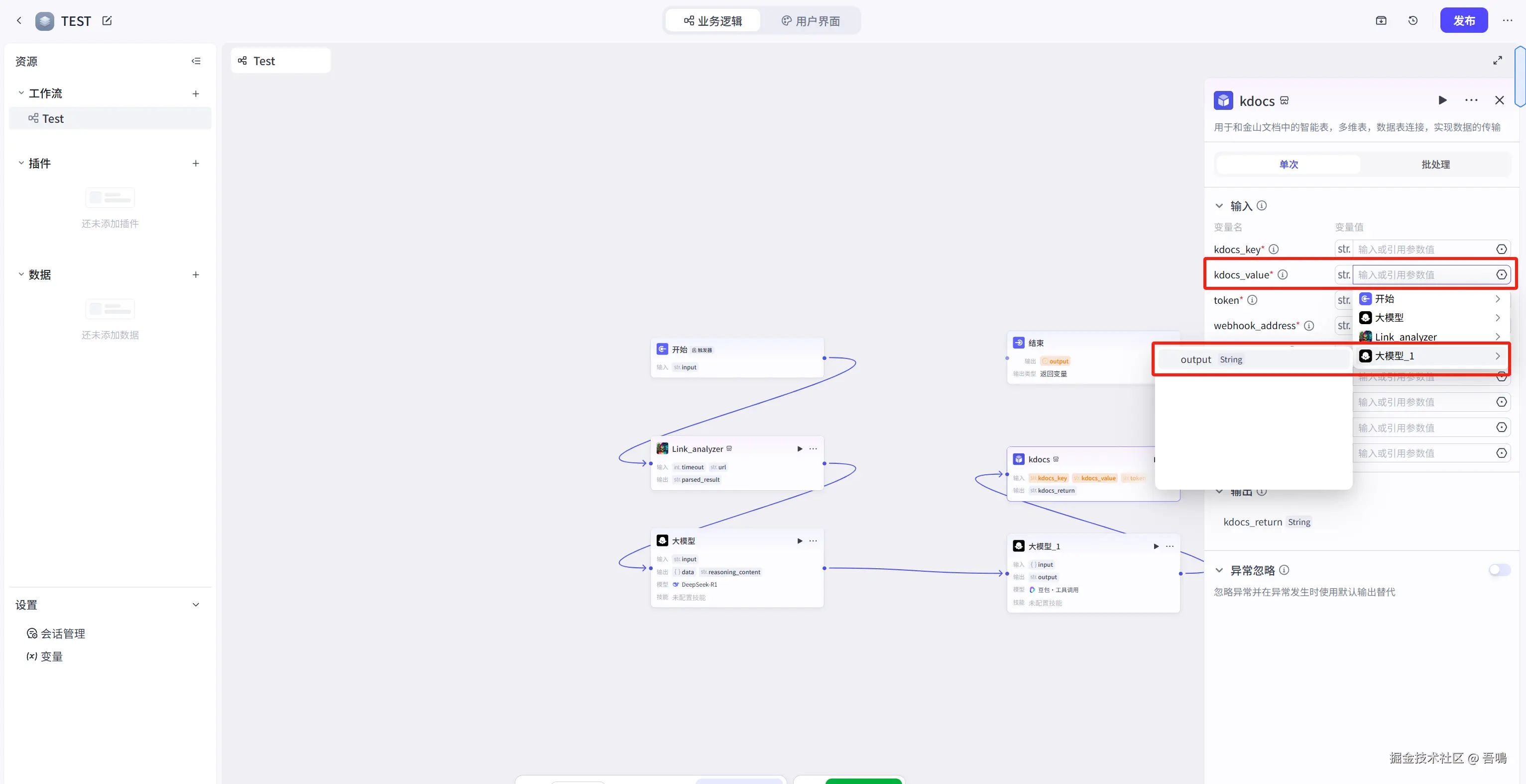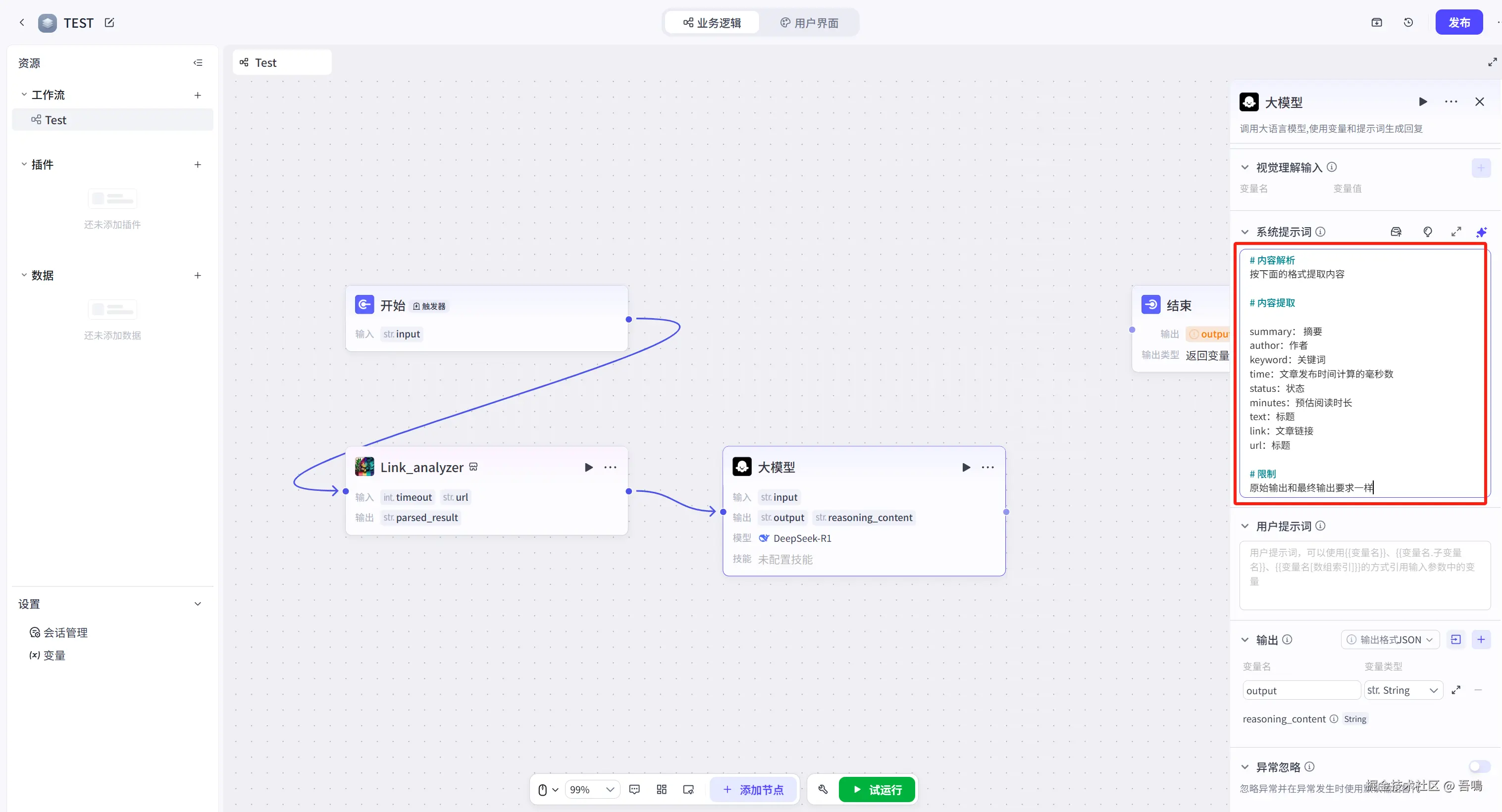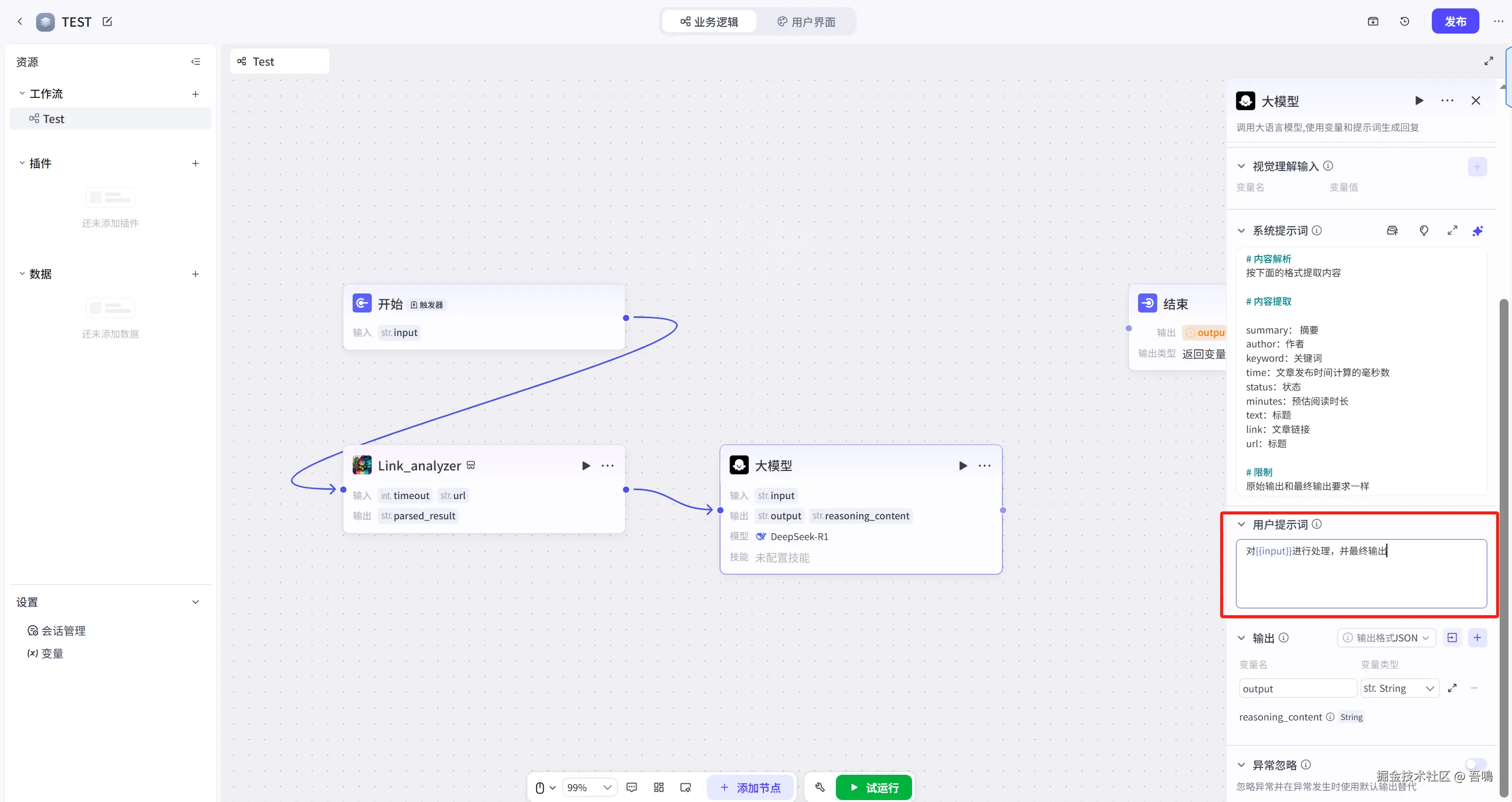 最后把最后一个节点的连线与结束节点连上即可,并且修改结束节点的输入参数,修改完之后,整个工作流就搭建完成了。
