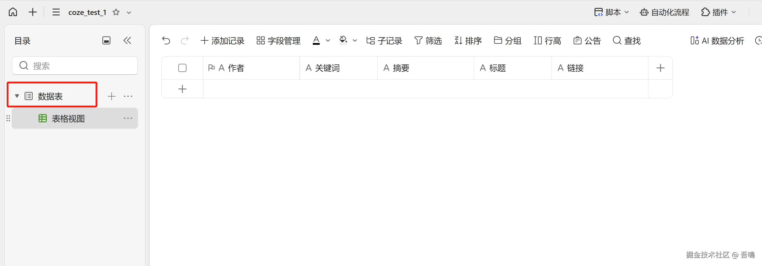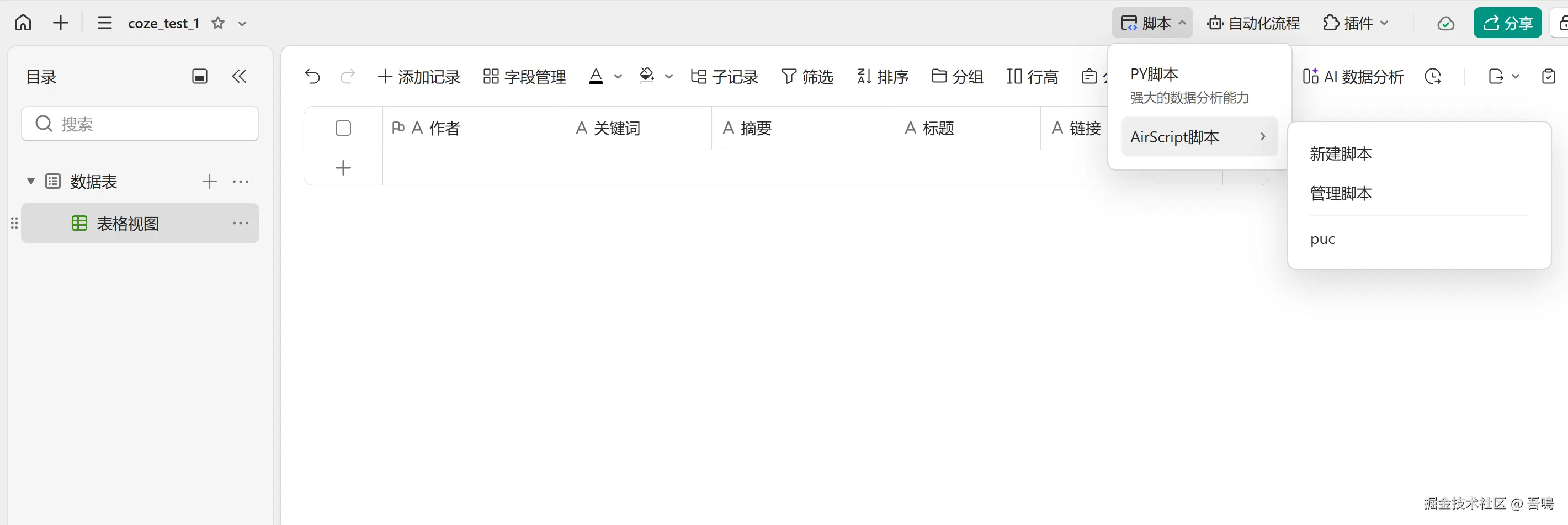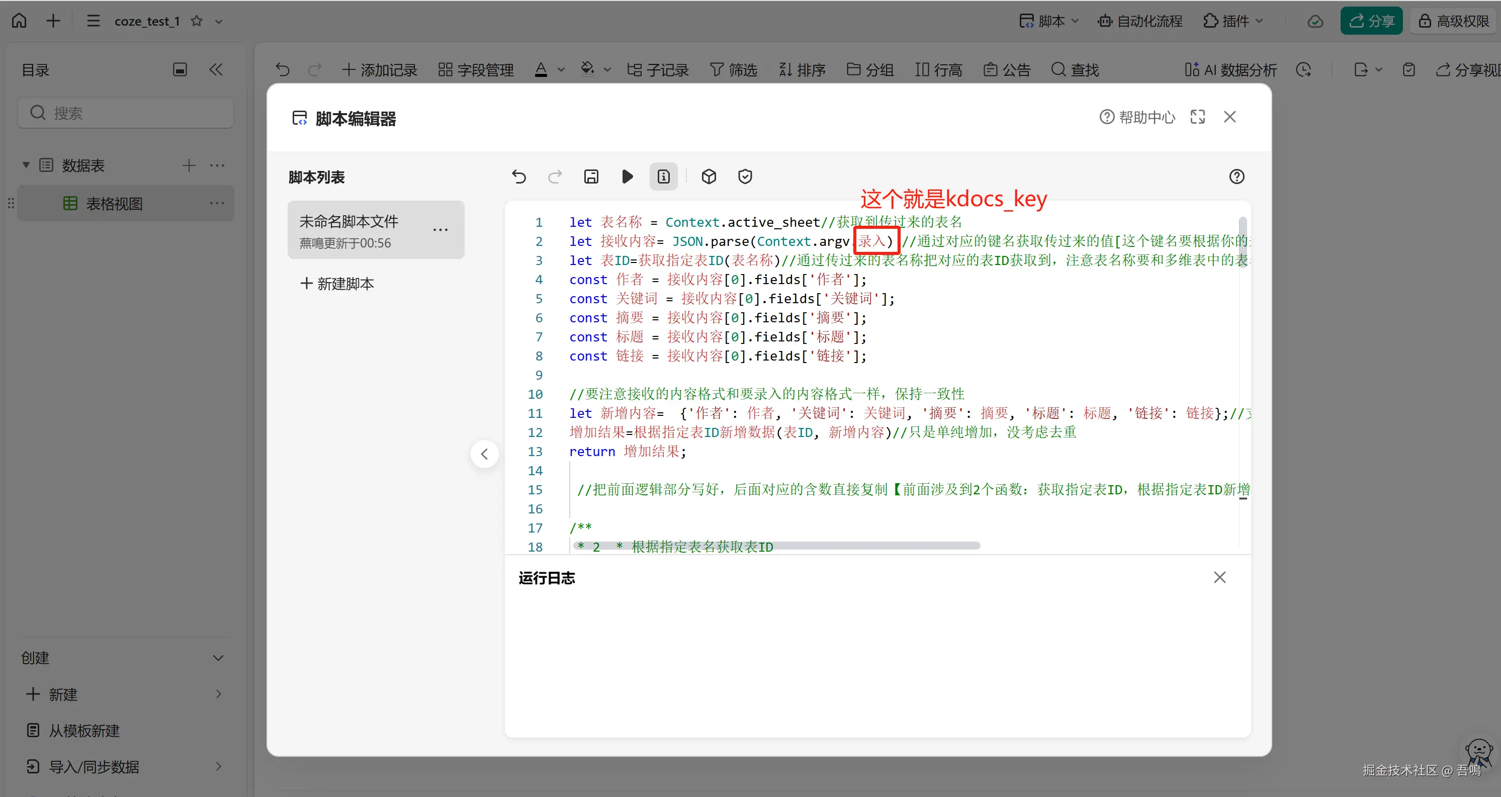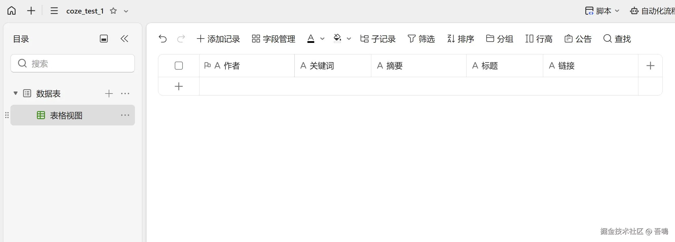 要写入金山文档多维表格,首先我们需要到金山文档上创建一个多维表格,创建好多维表格后,需要新建脚本,编写脚本内容(脚本内容,吾鳴已经和大模型节点中的提示词一起打包放到了文末)。
