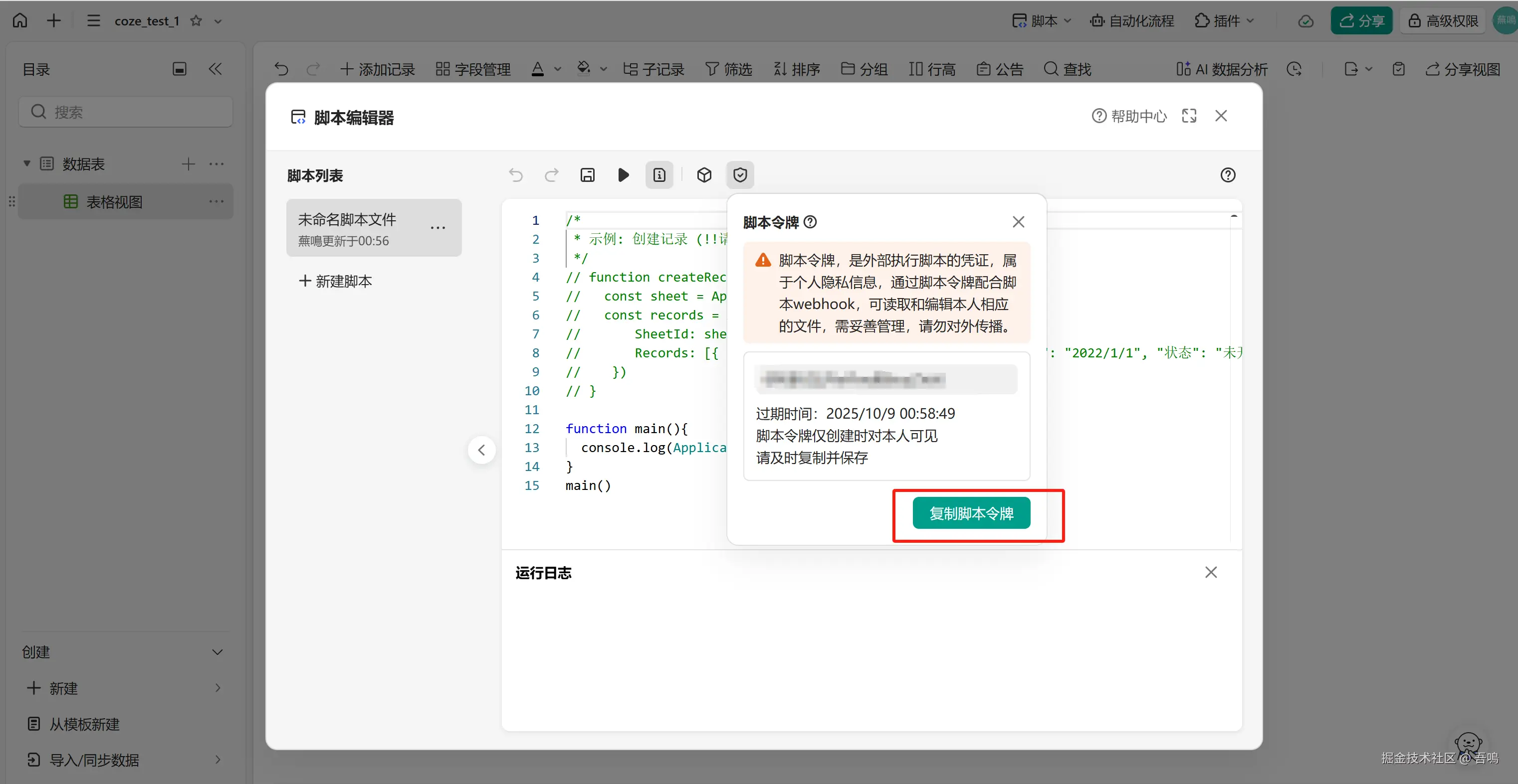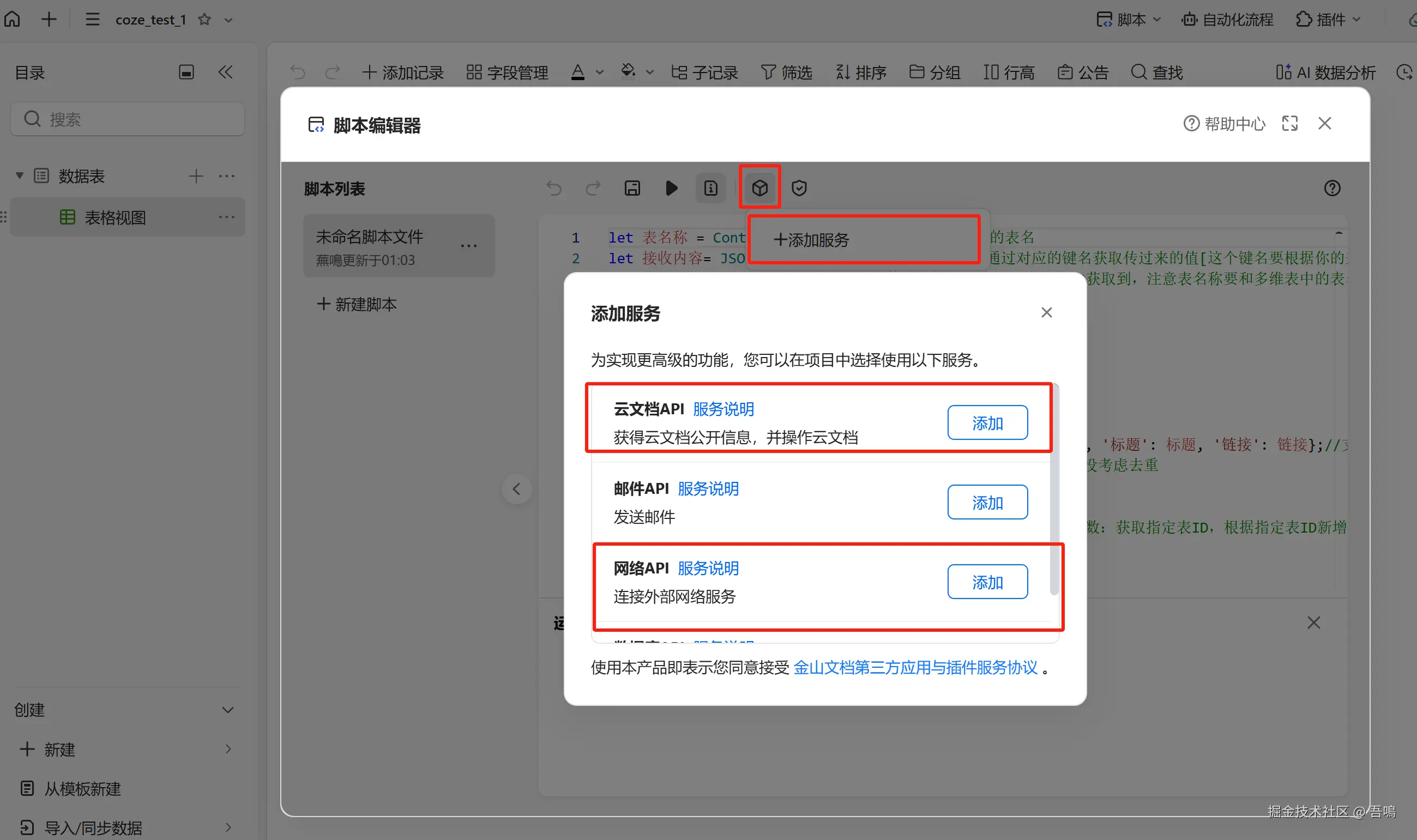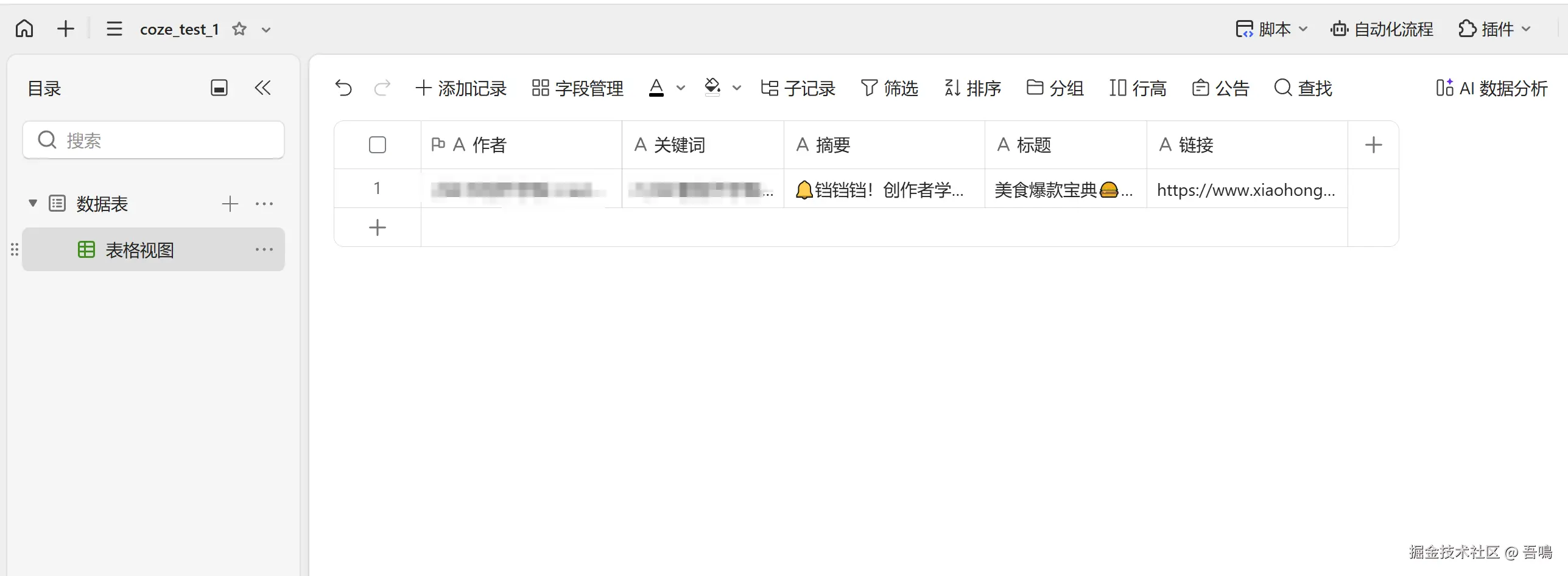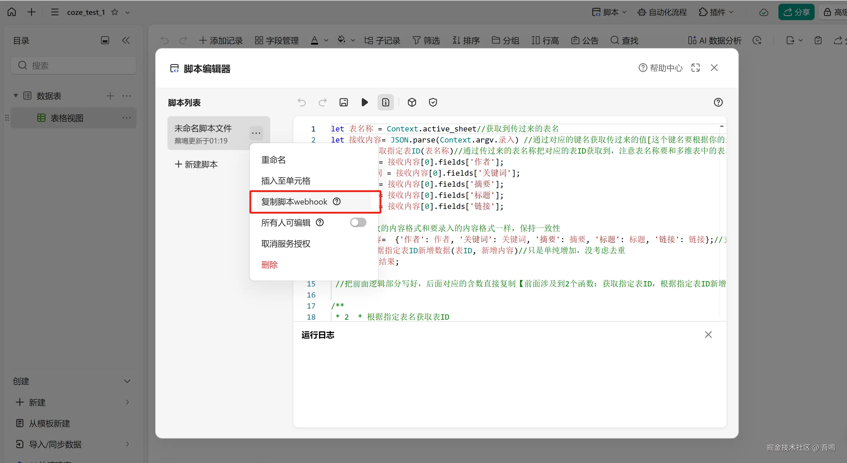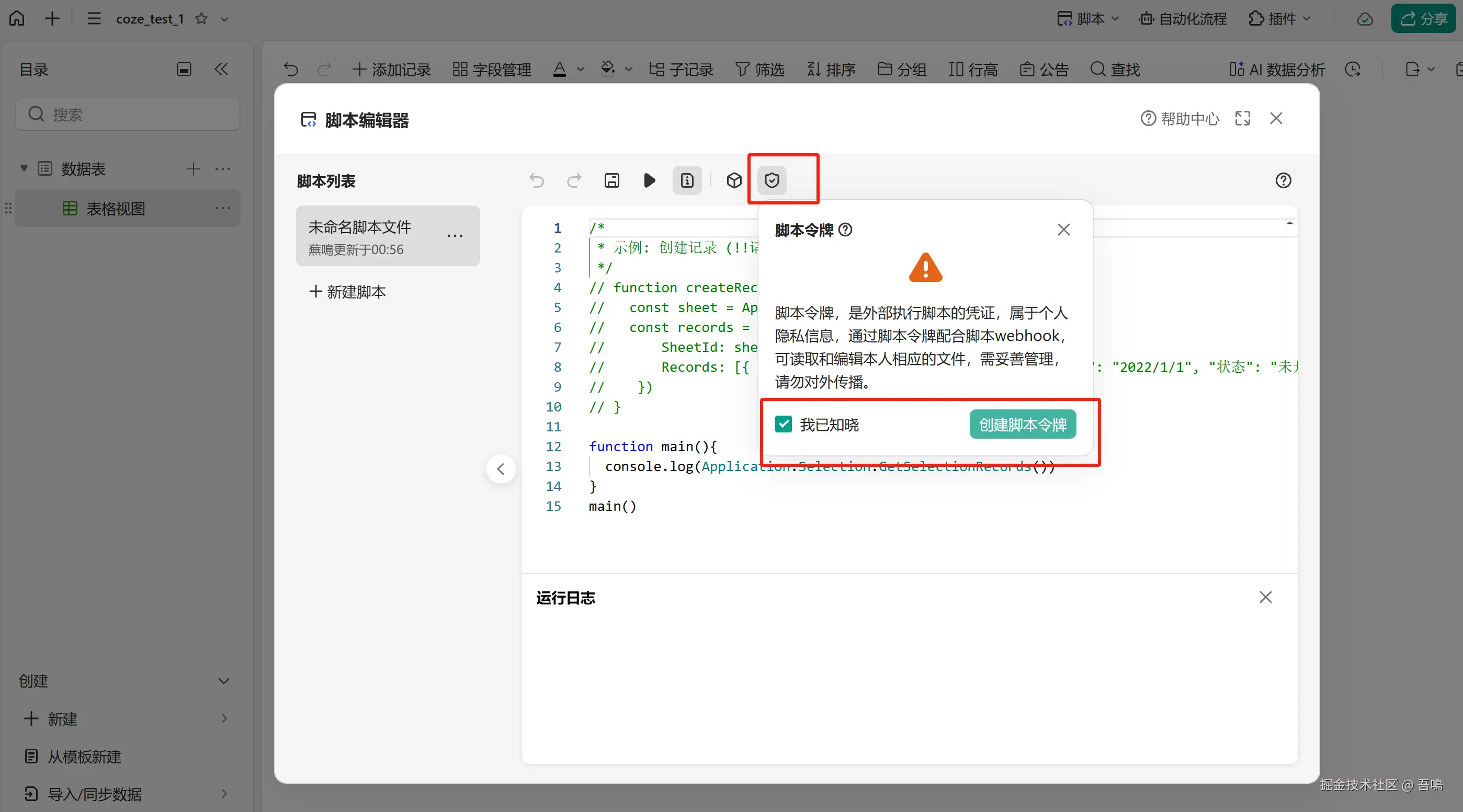 要写入金山文档多维表格,首先我们需要到金山文档上创建一个多维表格,创建好多维表格后,需要新建脚本,编写脚本内容(脚本内容,吾鳴已经和大模型节点中的提示词一起打包放到了文末)。